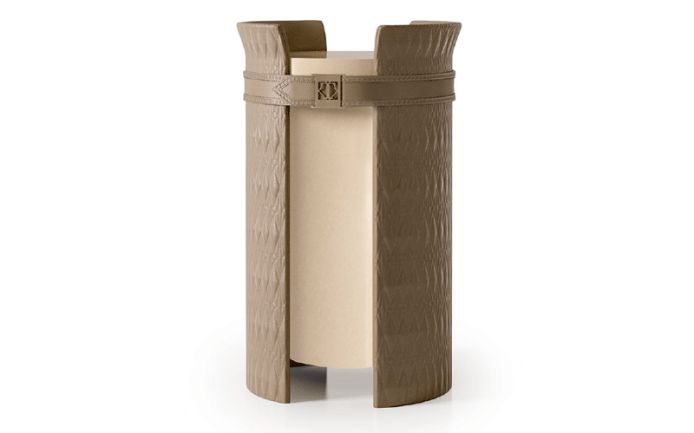 Колонна коллекции Numero Tre, характеризующаяся типичной простёжкой всей коллекции, выглядит как декоративный, но также и функциональный объект. Цилиндрическая форма подчеркивает чередование покрытых кожей и деревянных с отделкой глянцевым лаком деталей. Колонна коллекции Numero Tre доступна в различных вариантах отделки в соответствии с образцами.