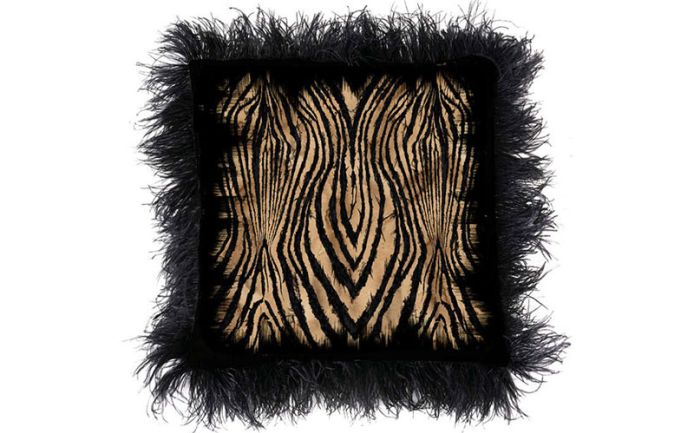 Декоративная подушка из ткани кат. Velvet RC Wild Zebra цв. Натуральный или цв. Бежевый. Опушка из страусиных перьев черного или голубовато-серого цвета. Набивка из гусиного пуха.