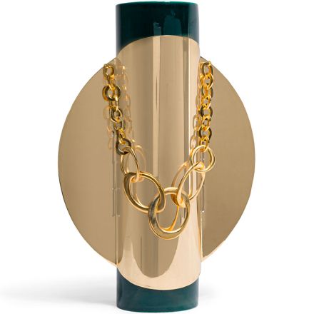 Керамическая ваза Bustier, зелёный хрусталь; латунные ушки; цепь из золотых овалов; черный кожаный шнур, латунный винт и шестигранник. H 46 см.