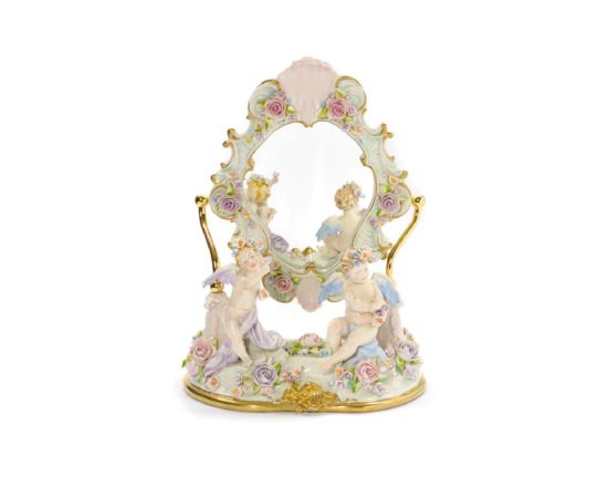 На основании зеркала примостились два ангельских создания с розовыми и голубыми крылышками и венками из цветов. Рама зеркала усыпана красивыми сиреневыми розами и полевыми цветами. Все красители на статуэтке выполнены на основе эфирных масел лаванды и ели. Статуэтка сочетает в себе не только престиж и роскошь, ее красота связана с итальянской историей и традициями.