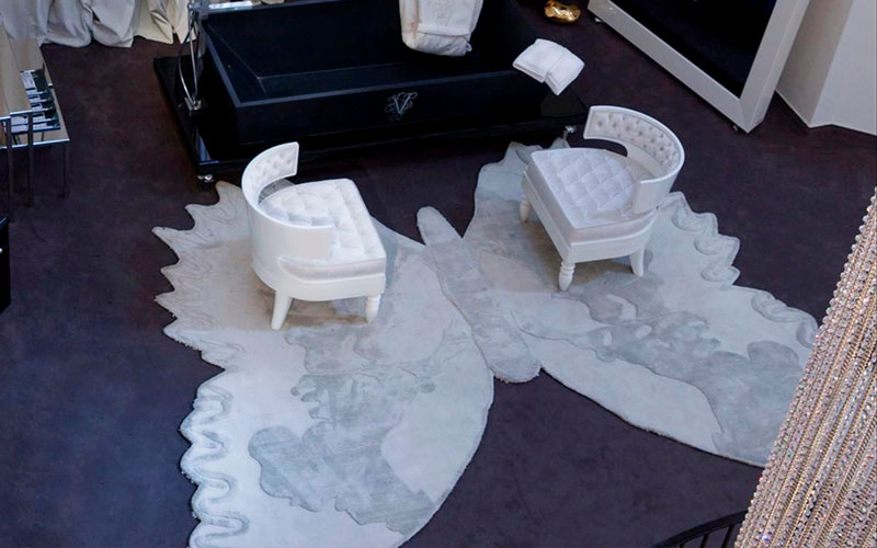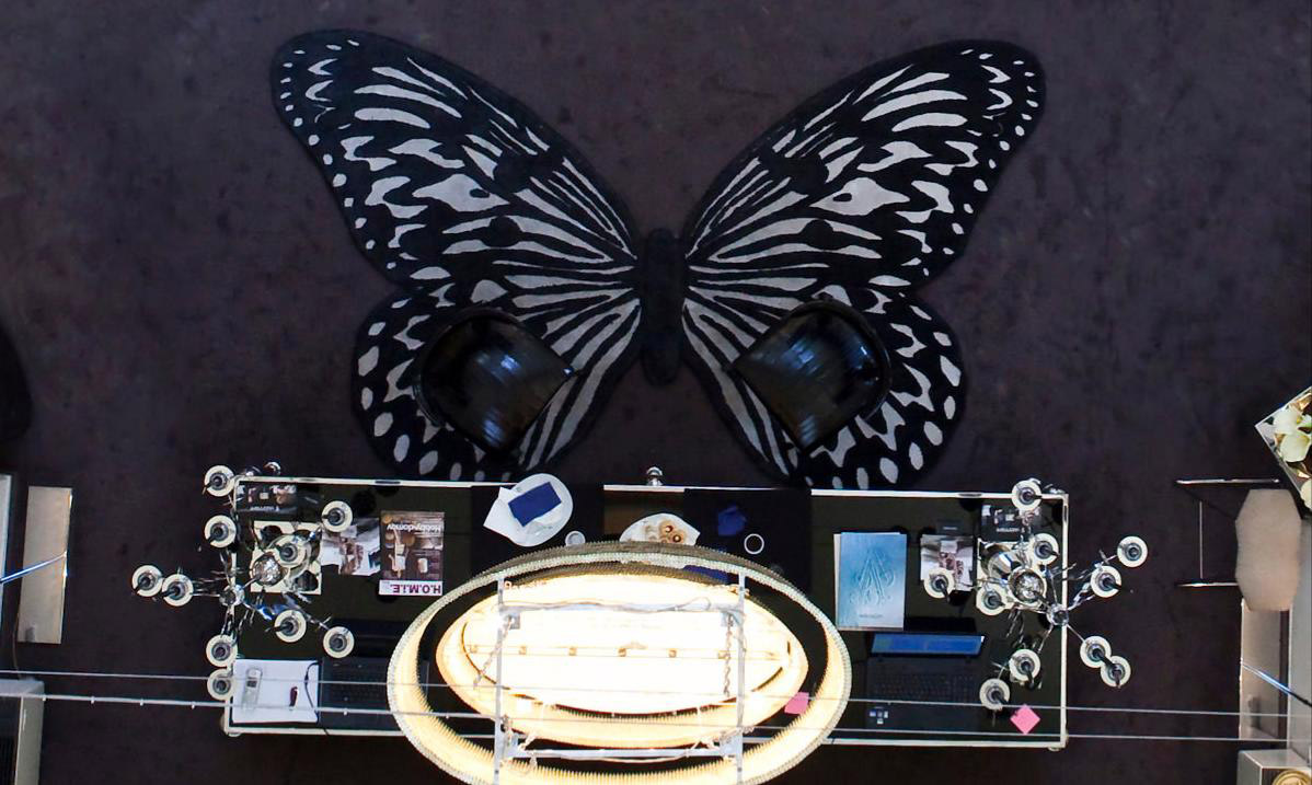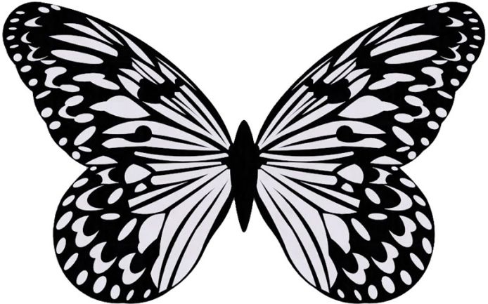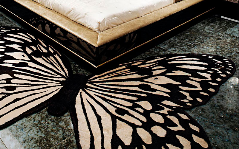 Ковер ручной работы в форме бабочки из шелка и тибетской шерсти. Тело бабочки в черном цвете, крылья черно-белые.
