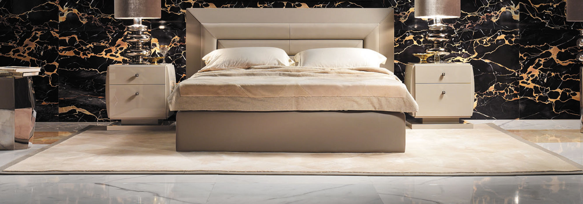 Ковер по периметру кровати с ромбовидным декором и окантовкой.