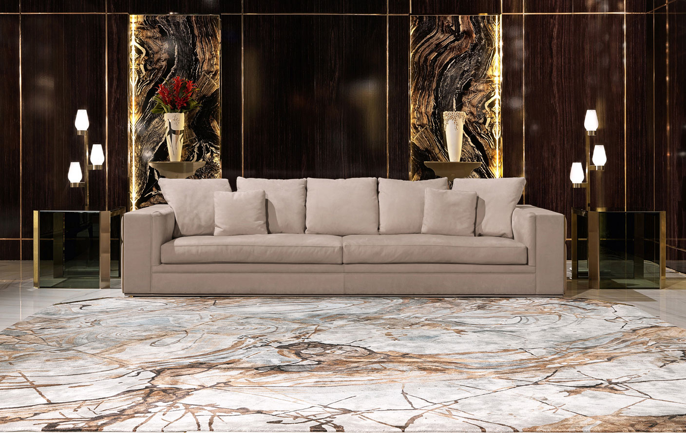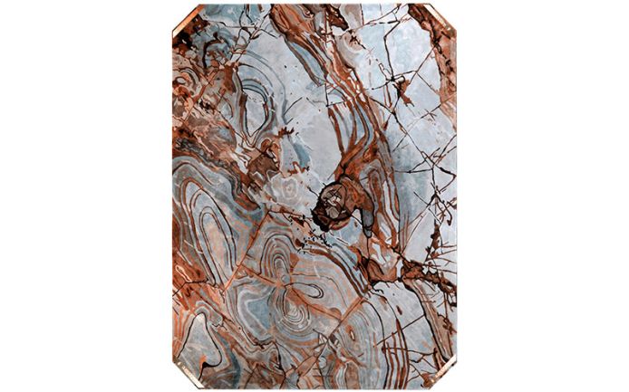 Ковер ручной работы из 100% бамбукового шелка; узор под мрамор; богатая палитра оттенков. Закругленные углы с четырьмя матовыми латунными вставками с логотипом Visionnaire в технике барельефа. Хлопковая основа.