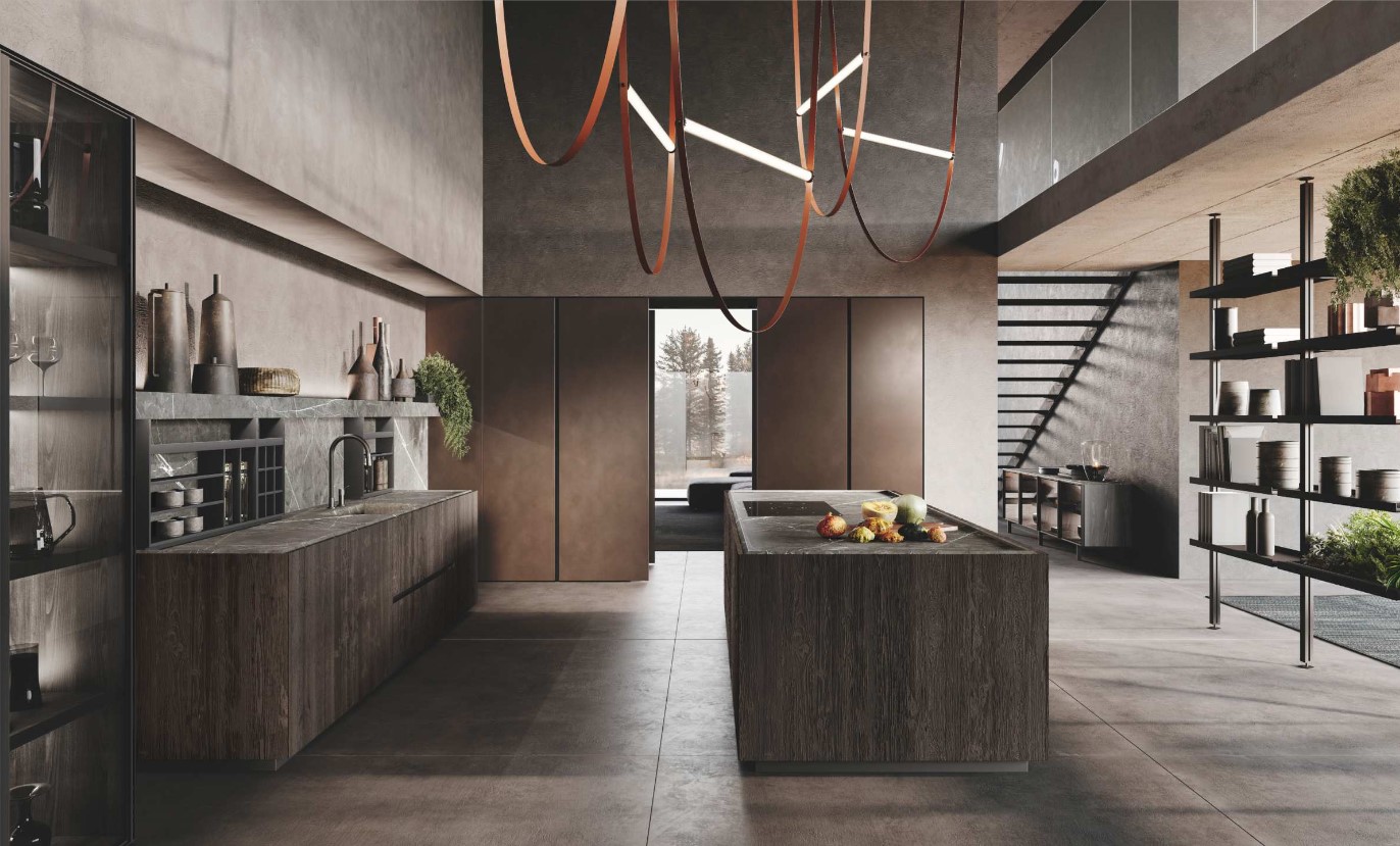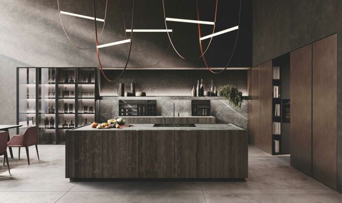 Два уникальных материала характеризуют удивительную композицию. Еще одним важным элементом является столешница Spiga, изготовленная из керамогранита. Это пространство - не только сочетание двух форм и материалов, является результатом взаимодействия человеческого творчества и природы, создавая уникальный и привлекательный дизайн.