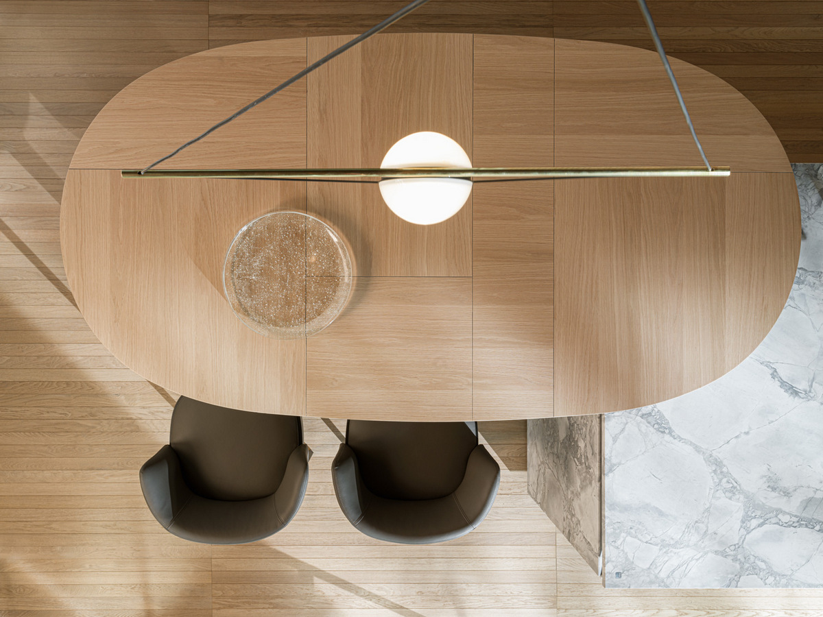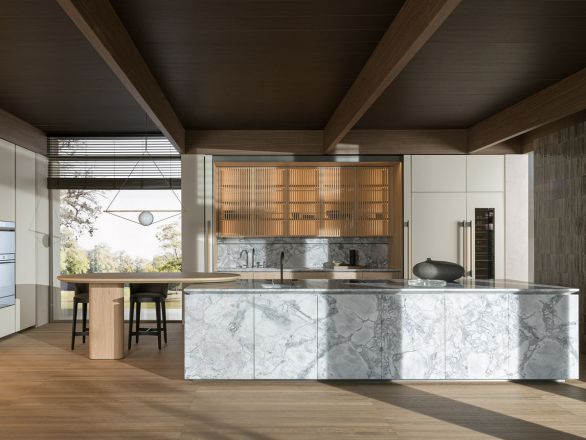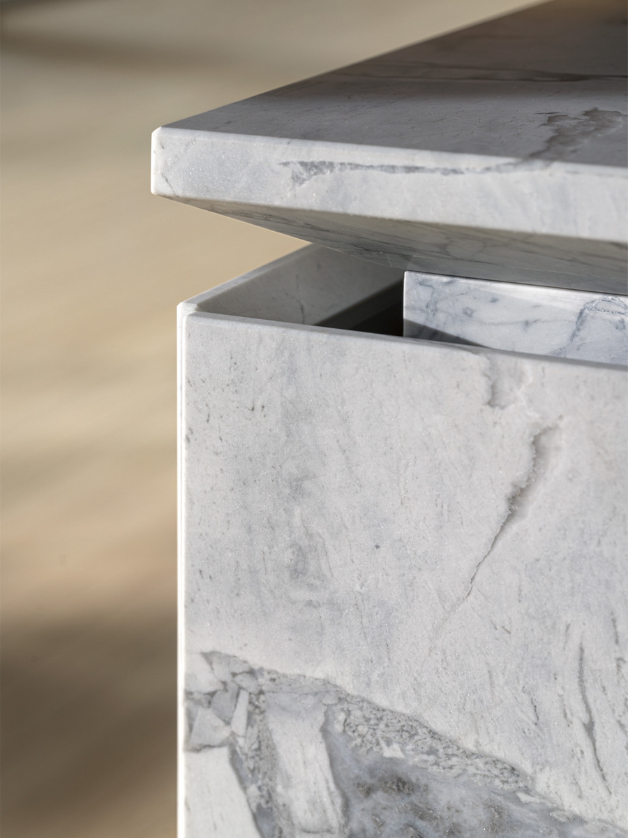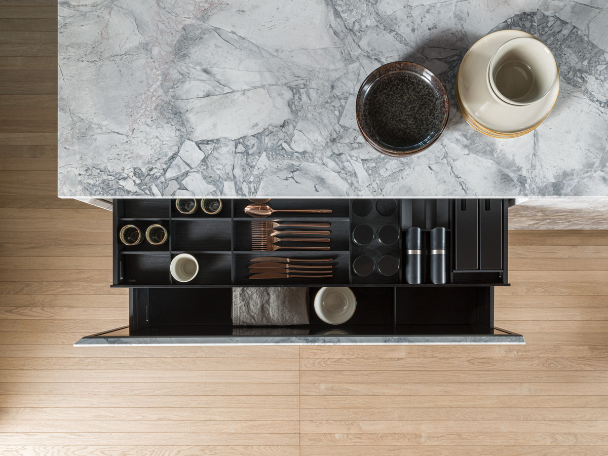 Поверхности пересекаются, создавая узоры света и теней, массивные столешницы с важными настраиваемыми секциями с почти незаметными профилями или секциями, высеченными как скульптуры.