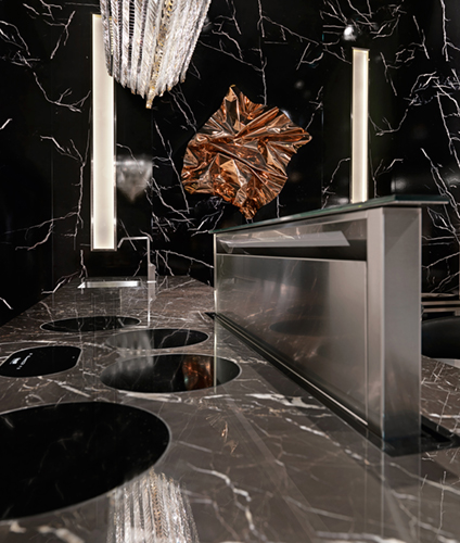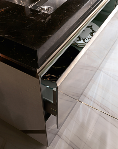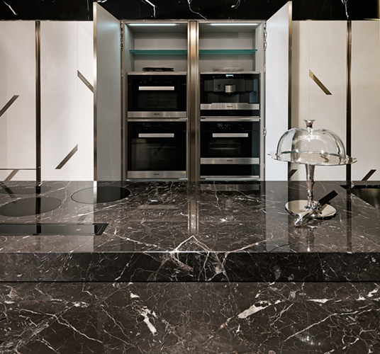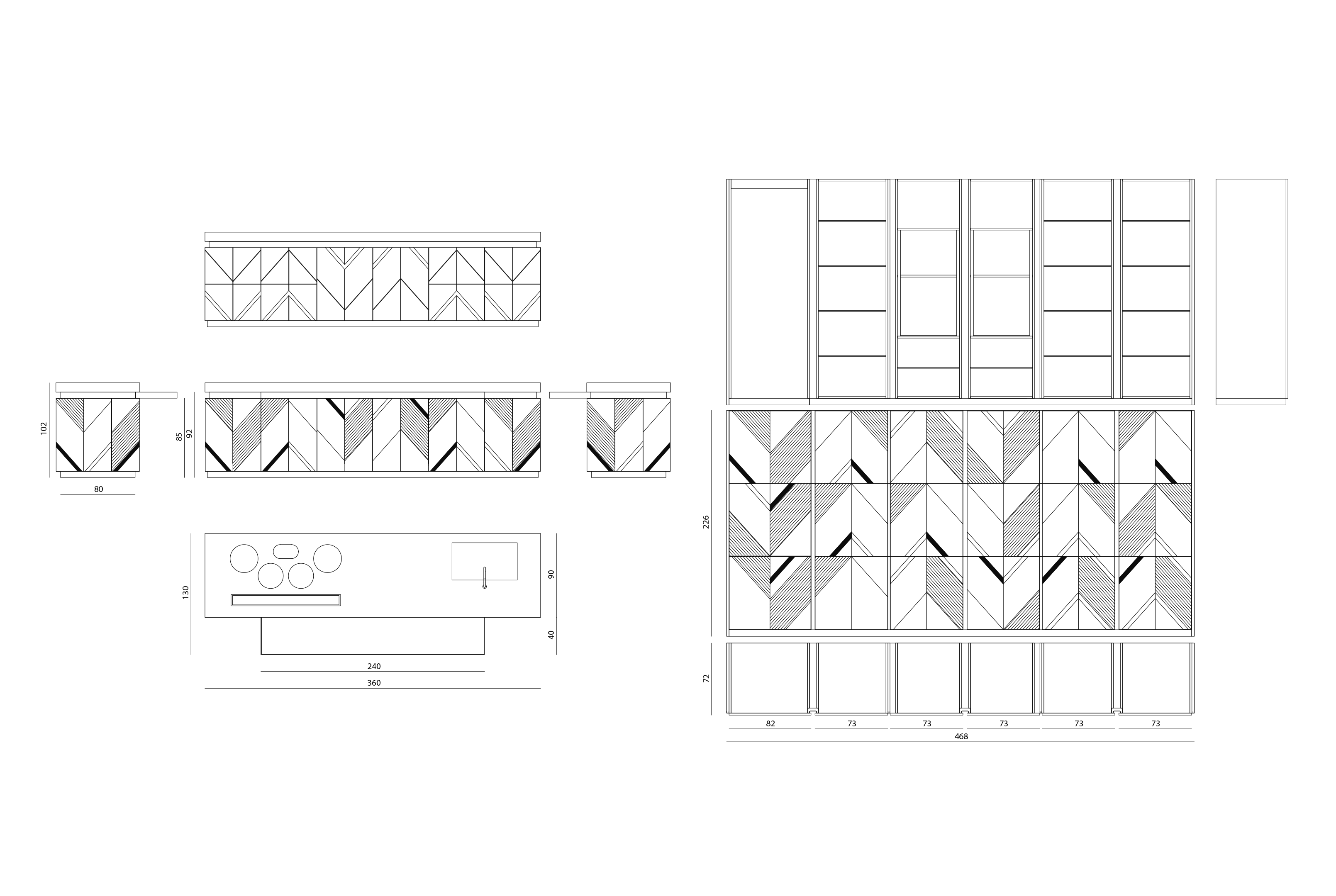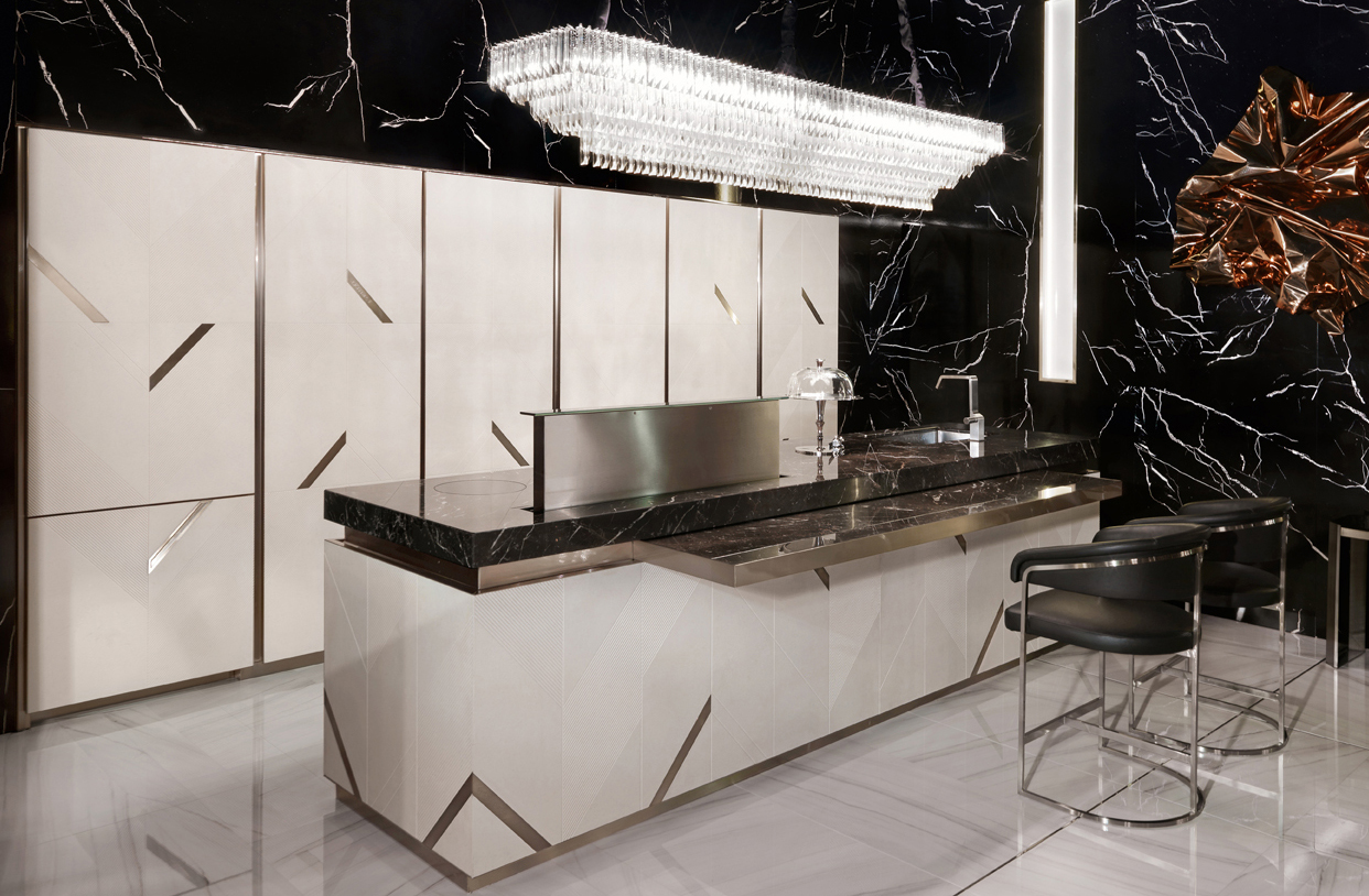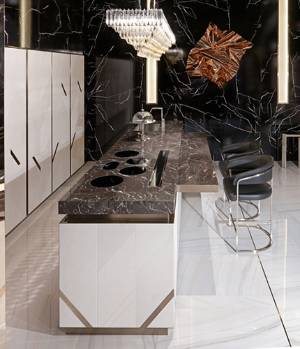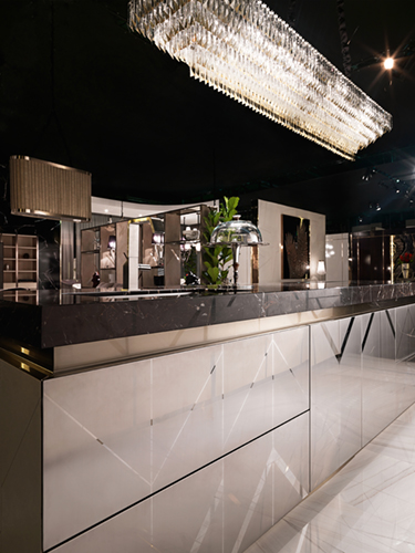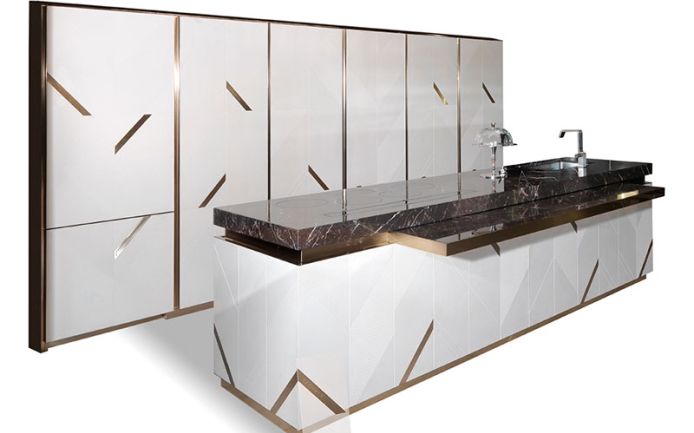 Остров с закусочной, 6-колонный настенный блок. Каркас из высокопрочной меламиновой древесно-стружечной плиты толщиной 19 мм; спинки из того же материала толщиной 10 мм; цвет - слоновая кость. Внутренние полки из матового безопасного стекла толщиной 10 мм.