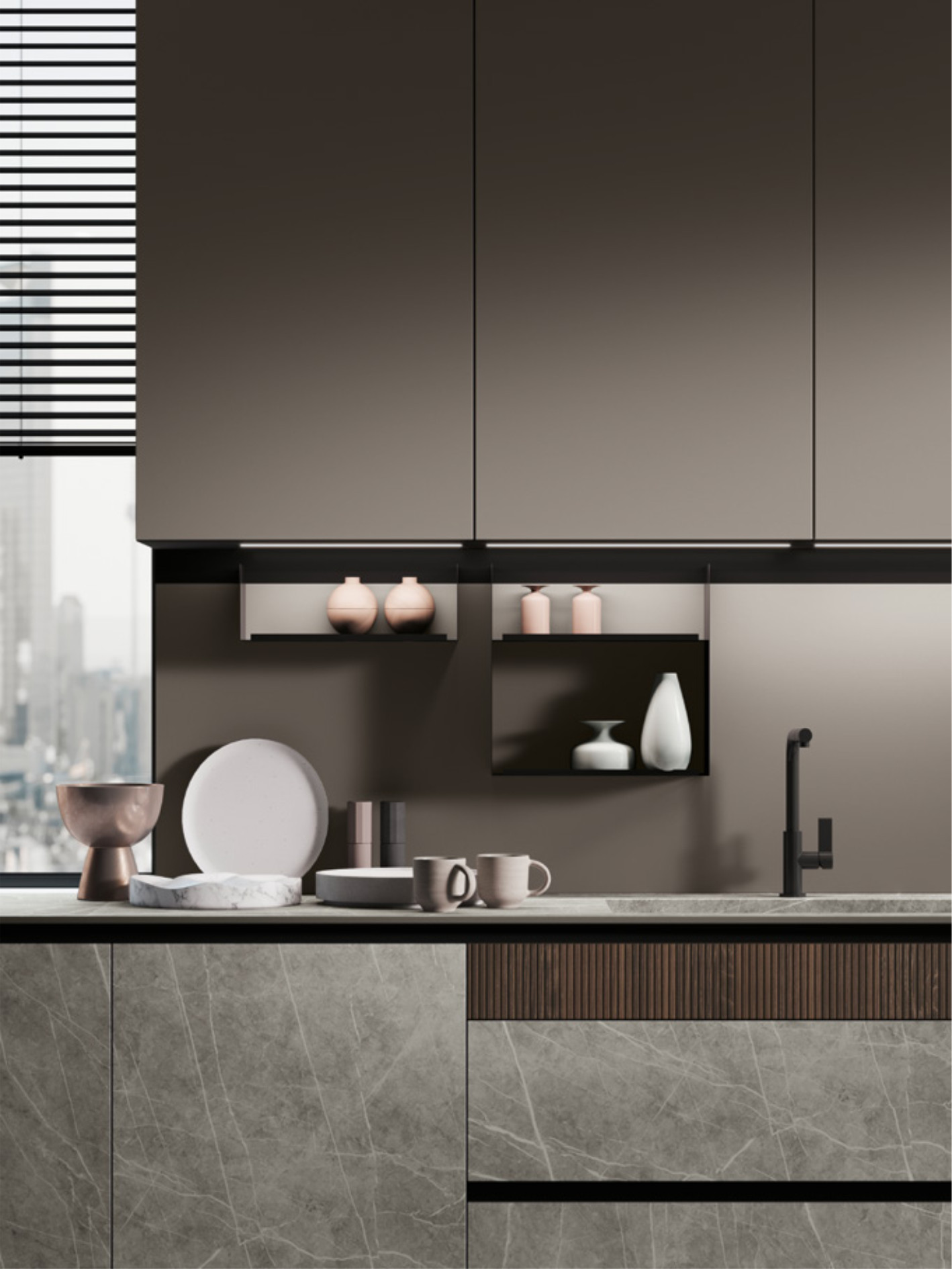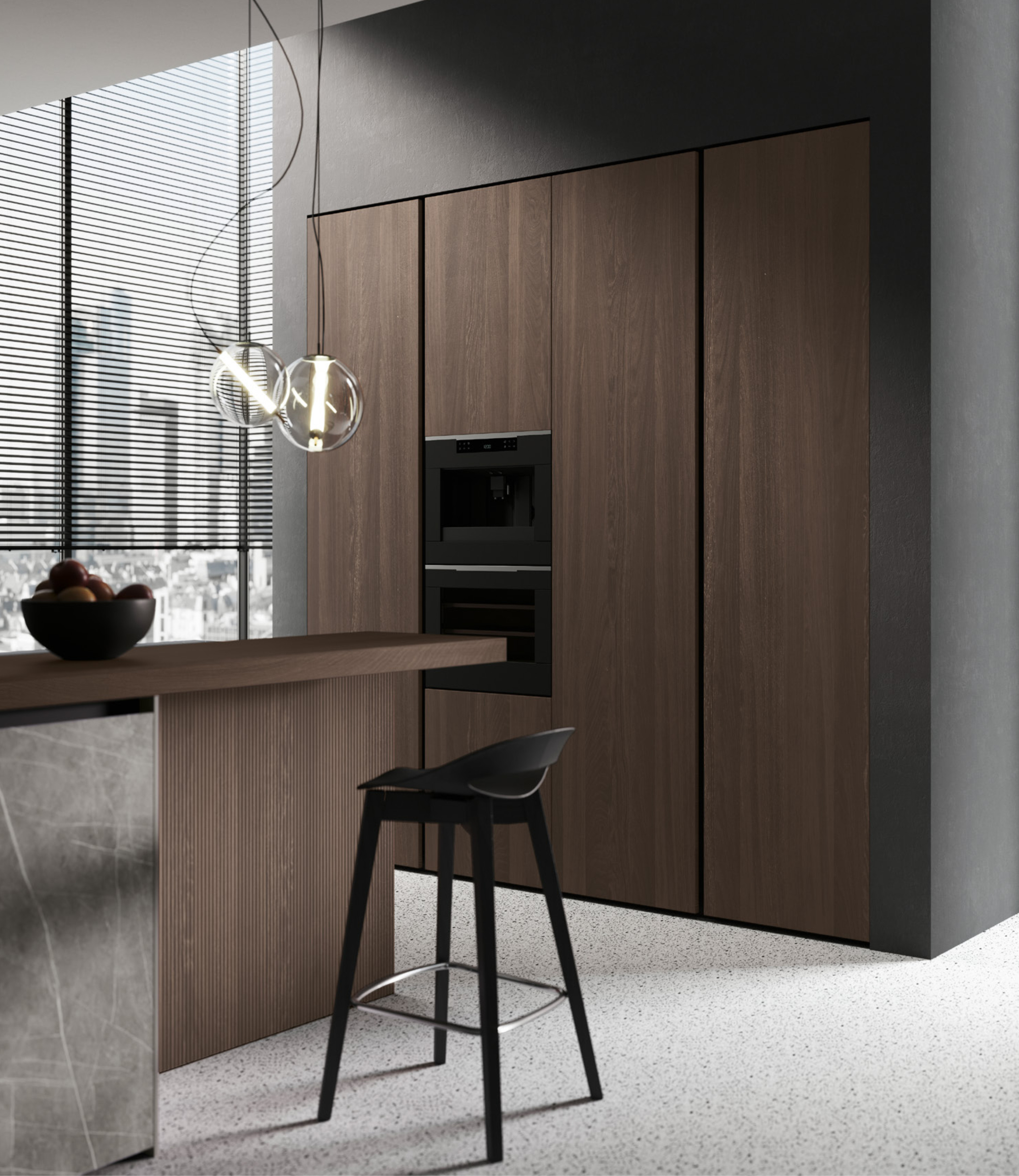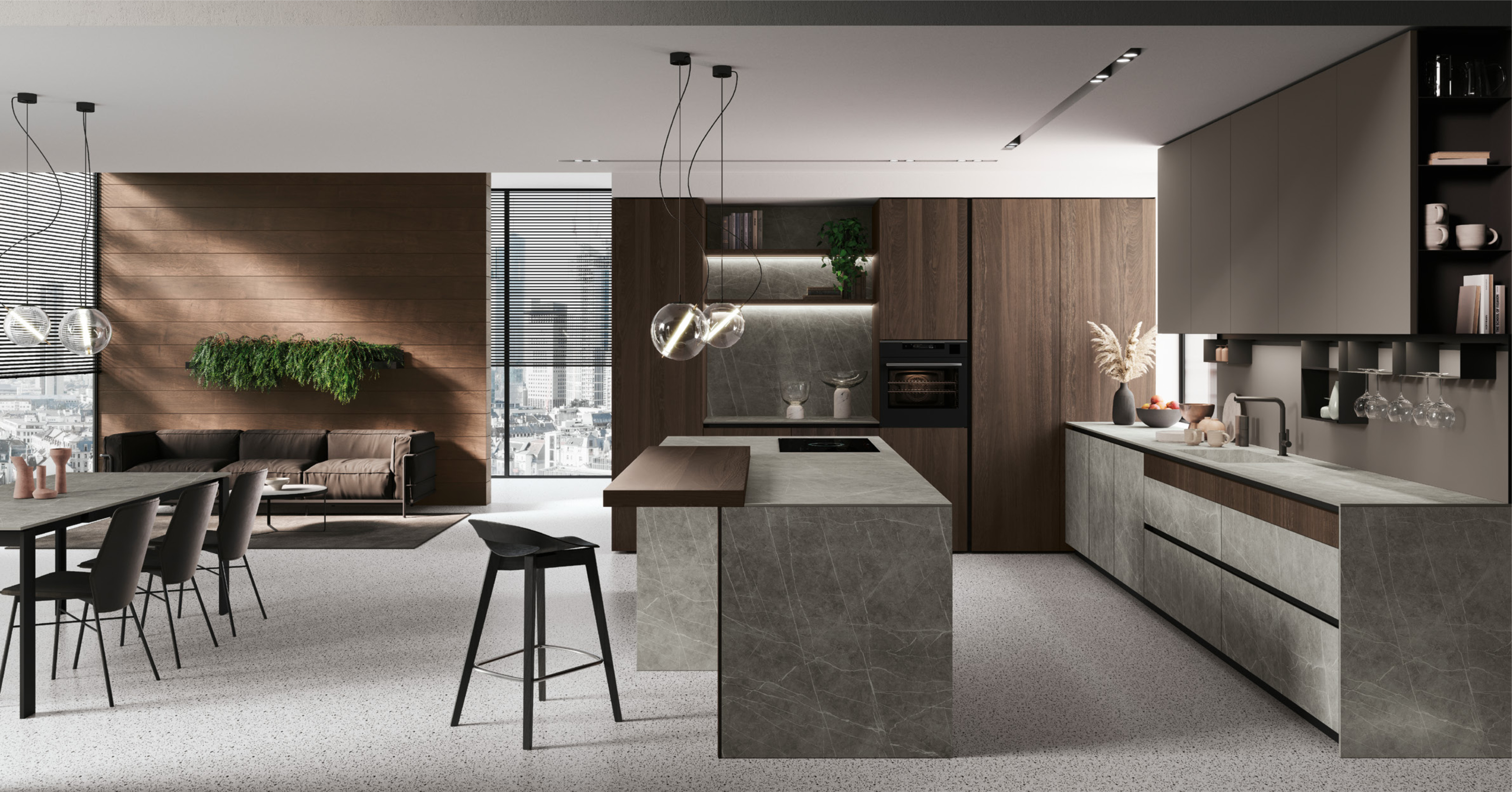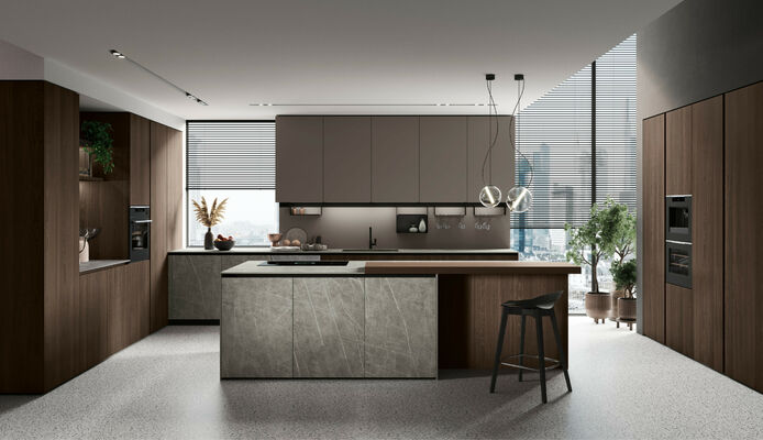 Дизайны Stosa отличаются не только потрясающим внешним видом, но и универсальностью, т.е. способностью вписаться в любое пространство. В этой композиции центральный остров с дверцами Neolith включает в себя зону для закусок из дерева с эффектом облицовки. Настенные шкафы дополнены системой Joy, оснащенной заставкой.