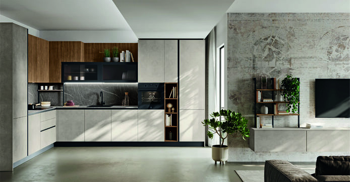 Материалы, выбранные для коллекции Kaya, создают уникальную и неповторимую обстановку, в которой элегантные деревянные поверхности компенсируются строгой отделкой с эффектом камня. Угловая композиция, закрытая с двух сторон вмещает все основные функции и характеризуется взаимопроникающими открытыми отделениями и навесными шкафами, которые создают оригинальные пространства для хранения домашних вещей.