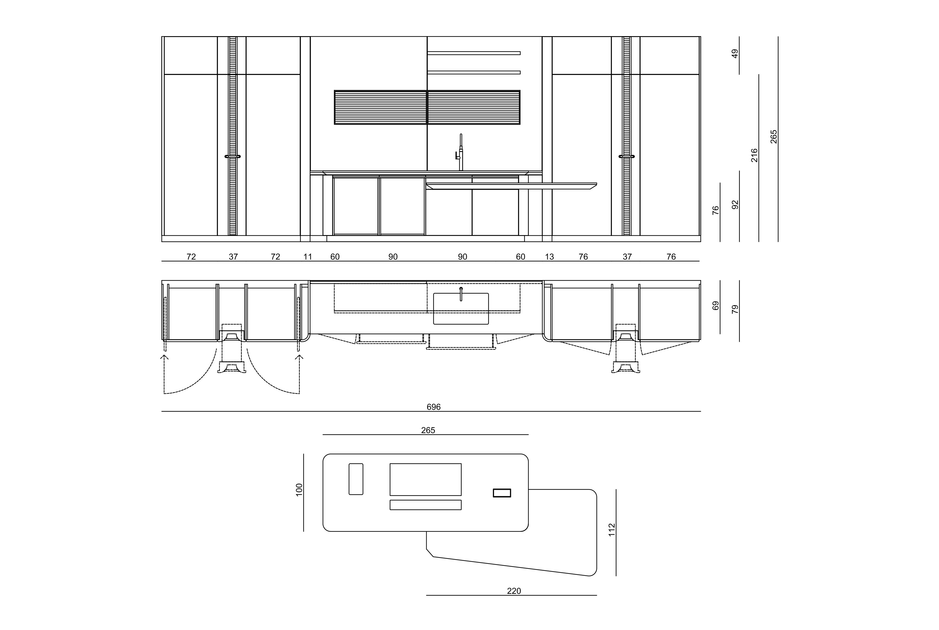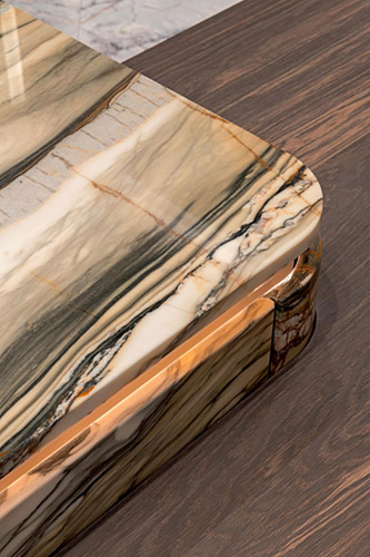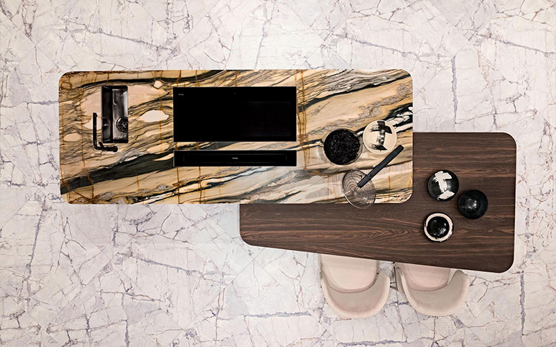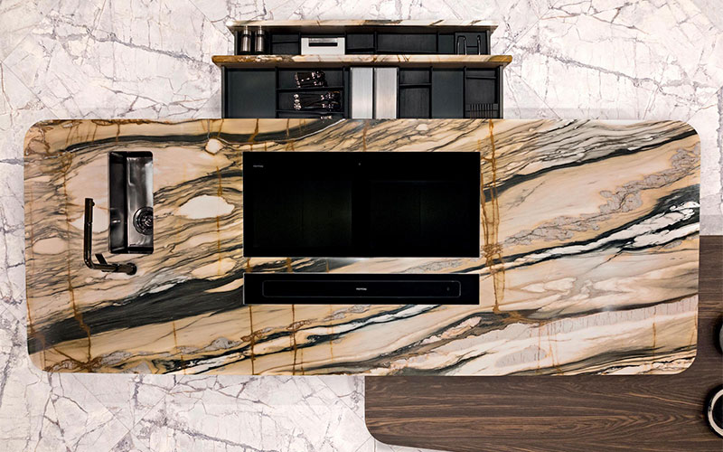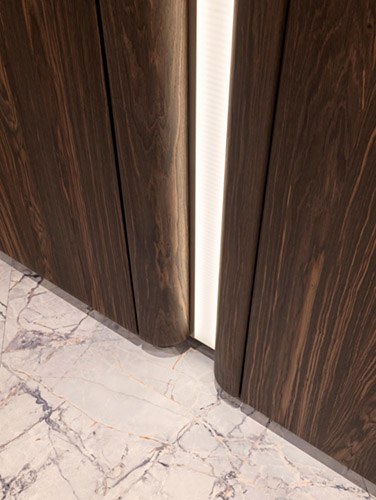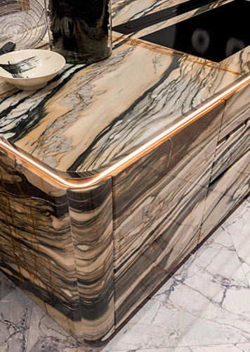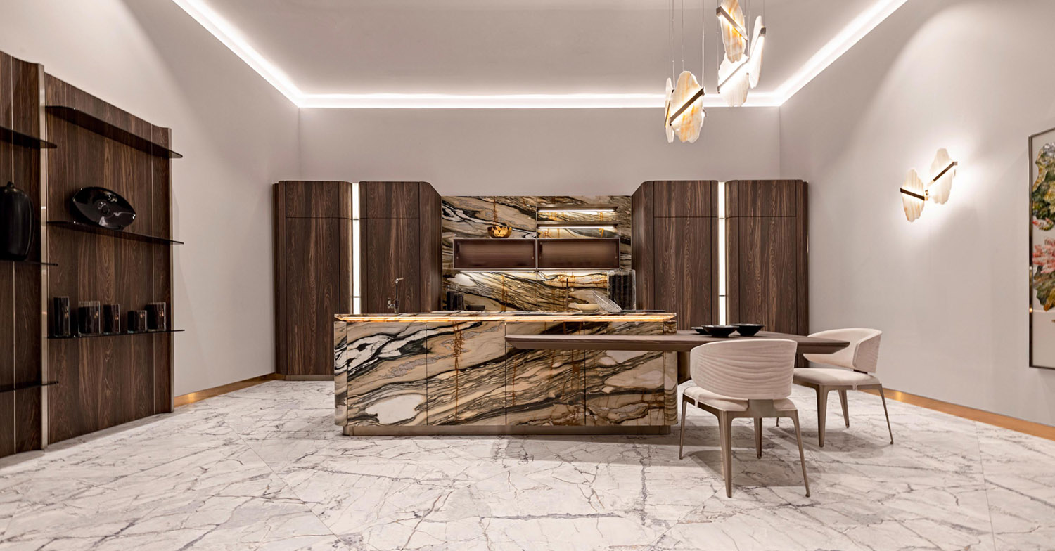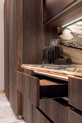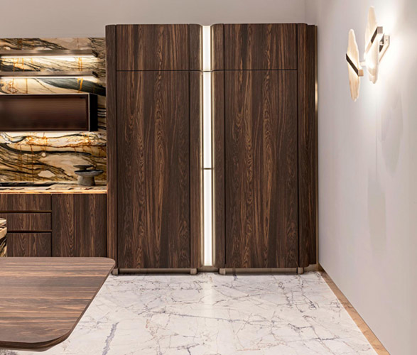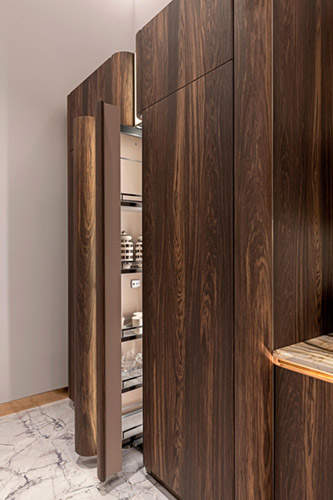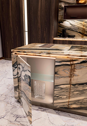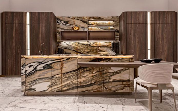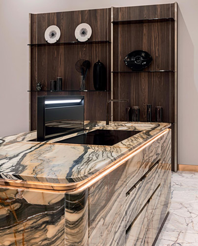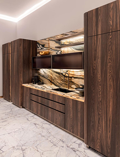 Кухня из мрамора и дерева. Настенные модули: высокие шкафы, оснащенные полками с возможностью встраивания холодильного или кухонного оборудования.