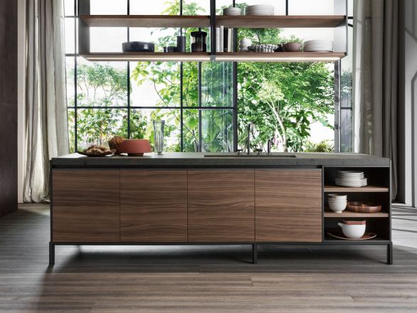 Vincent Van Duysen переосмысливает деталь утопленной ручки в современном и утонченном ключе, создавая контраст между тонкими боковыми и торцевыми блоками и значительной толщиной столешниц, которые сочетаются, нарушая линейность столешницы, с чашами для раковины из камня.