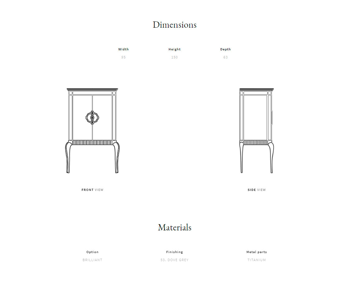 Каркас из массива дерева, резные ножки ручной работы. Внутри установлены стеклянные полки и выдвижные ящики (зеркальная задняя панель бронзового оттенка). Двери из лакированной древесины с латунными ручками.