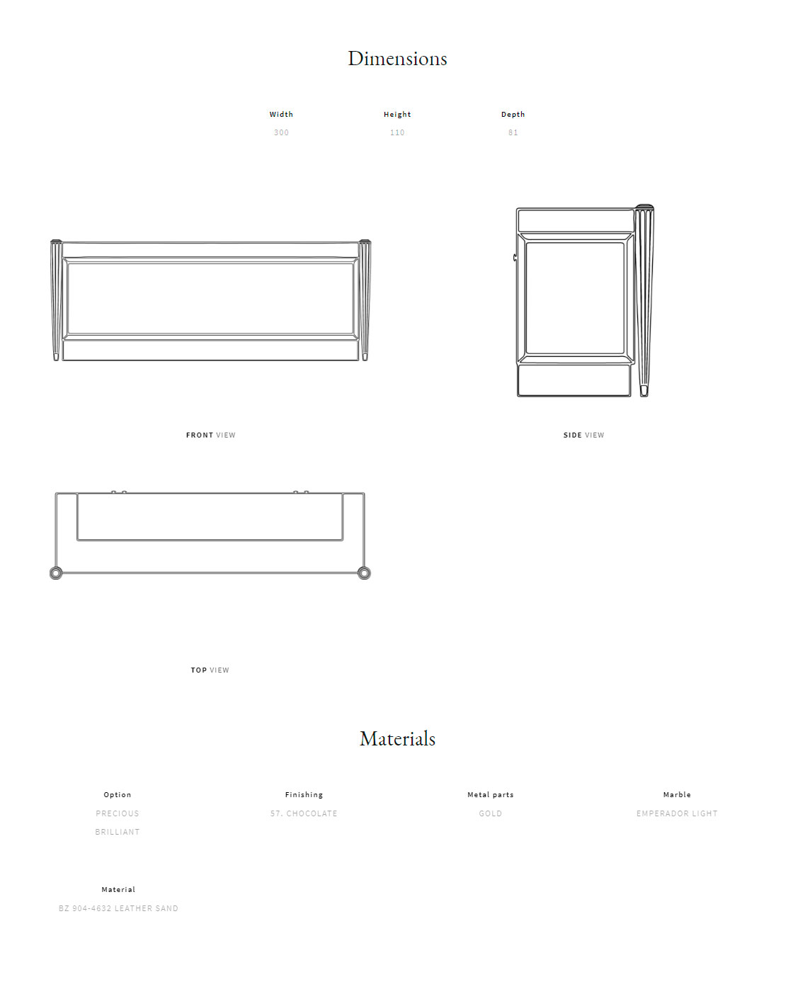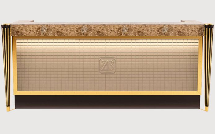 Деревянная рама из МДФ и фанеры. Мраморная столешница. Передняя отделка из стеганой кожи. Металлические и деревянные декоративные колонны. Светодиодное освещение.