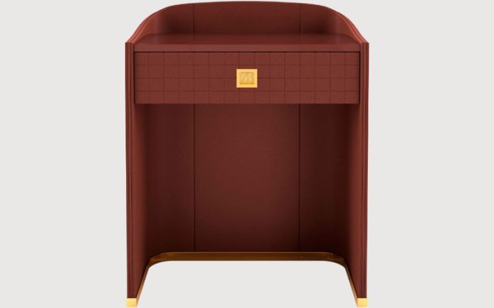 Изогнутая фанерная рама, обтянутая стеганой кожей. Выдвижной ящик из фанеры. Металлические детали.
