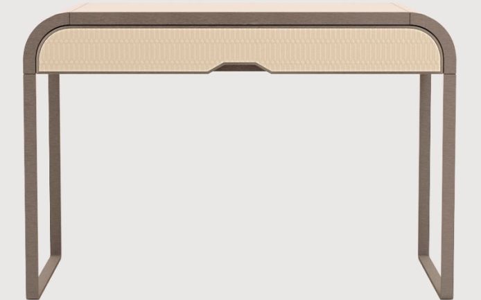 Сатинированный металл и изогнутая фанерная рама. Выдвижной ящик с отделкой стеганой кожей.