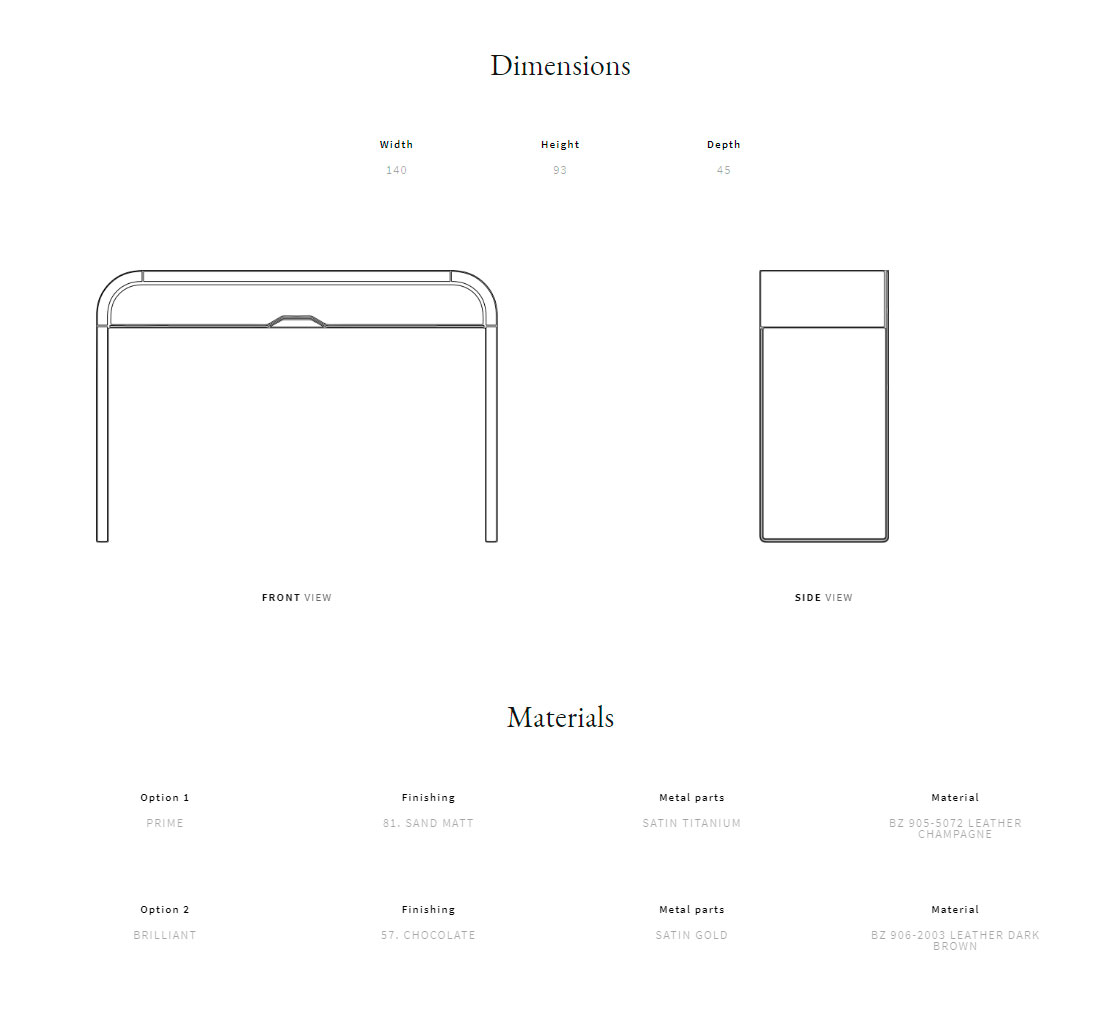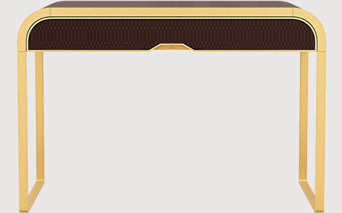 Сатинированный металл и изогнутая фанерная рама. Выдвижной ящик с отделкой стеганой кожей.