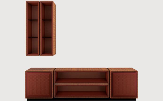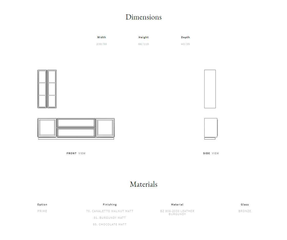Каркас из массива дерева и фанеры. Доступные материалы внешнего каркаса: лакированная древесина или шпон ореха каналетто. Лакированный внутренний каркас. Задняя панель отделана стеганой алькантарой. Хрустальные полки бронзового цвета.
