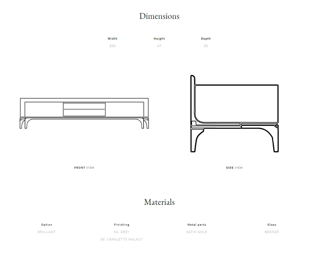Каркас из массива дерева и фанеры. Верхняя часть каркаса из шпона ореха каналетто. Передние ножки и ручки из сатинированного металла. Хрустальная полка бронзового цвета.