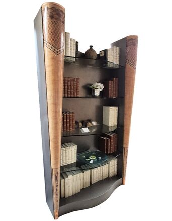 Высокий открытый книжный шкаф с фигурными полками из прозрачного стекла, изготовлен из натуральной древесины. Высокие боковые колонны конической формы, изготовленные из натуральной древесины орехового оттенка, декорированы орнаментальной интарсией ценными породами дерева.