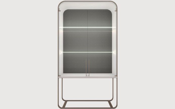 Каркас из металла и дерева. Выполнена наружная отделка стеганой кожей. Лакированная внутренняя поверхность, хрустальные полки со светодиодной подсветкой, задняя панель отделана стеганой кожей. Двери из закаленного стекла с латунными ручками.