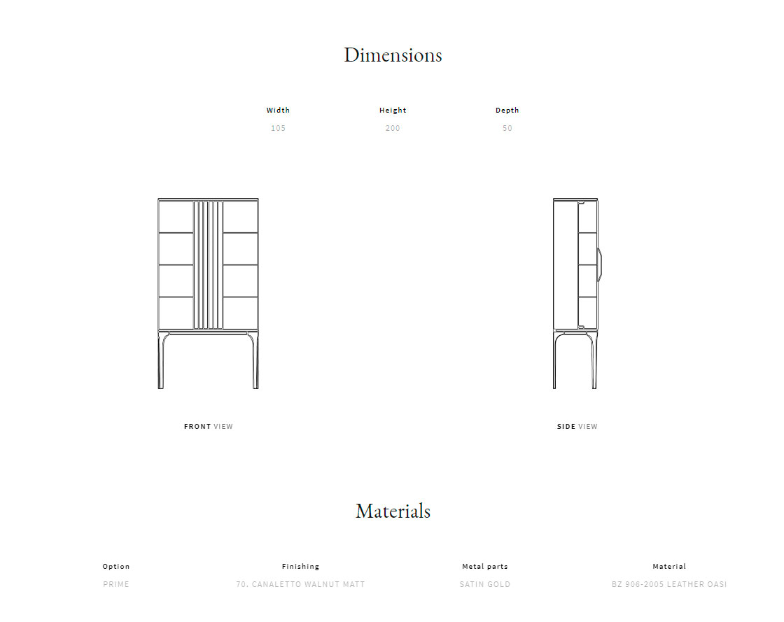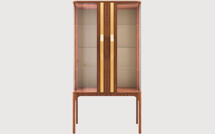 Каркас из массива ореха каналетто. Внутри установлены стеклянные полки, задняя панель отделана стеганой кожей. Двери выполнены из гнутого стекла и древесины ореха каналетто. Ручки из сатинированного металла.