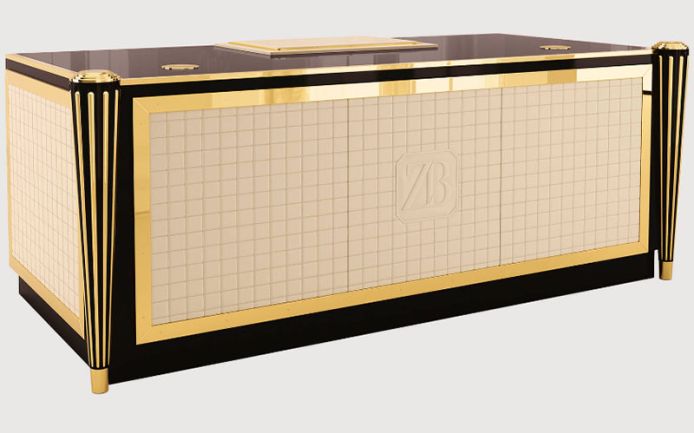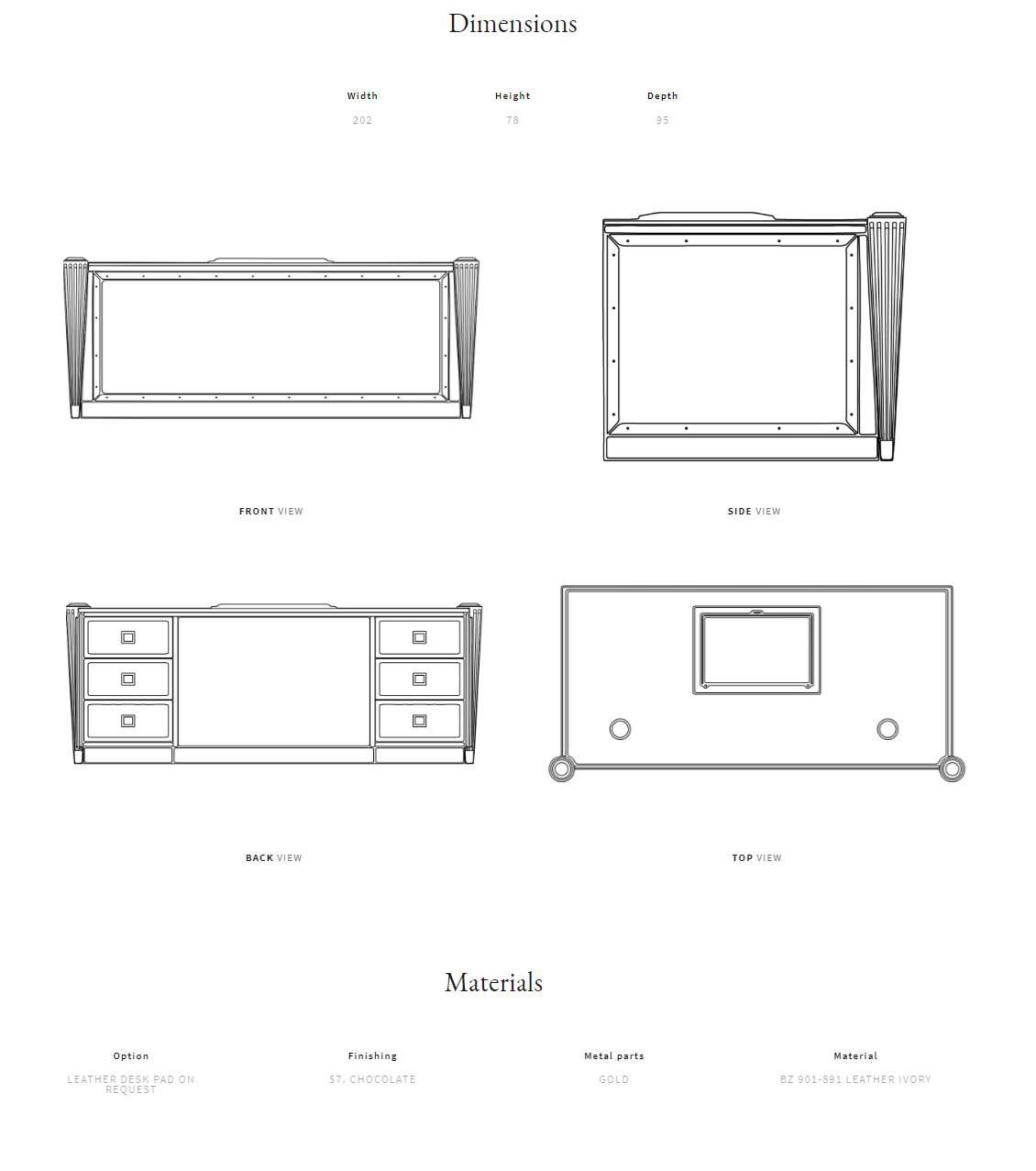 Рама из массива дерева, фанеры и МДФ. Столешница из лакированной древесины. Внешняя часть каркаса и выдвижные ящики с отделкой стеганой кожей, металлические детали. Ножки из дерева и латуни. Доступен с одной или двумя заглушками для кабеля. Кожаную настольную подкладку можно приобрести по запросу.