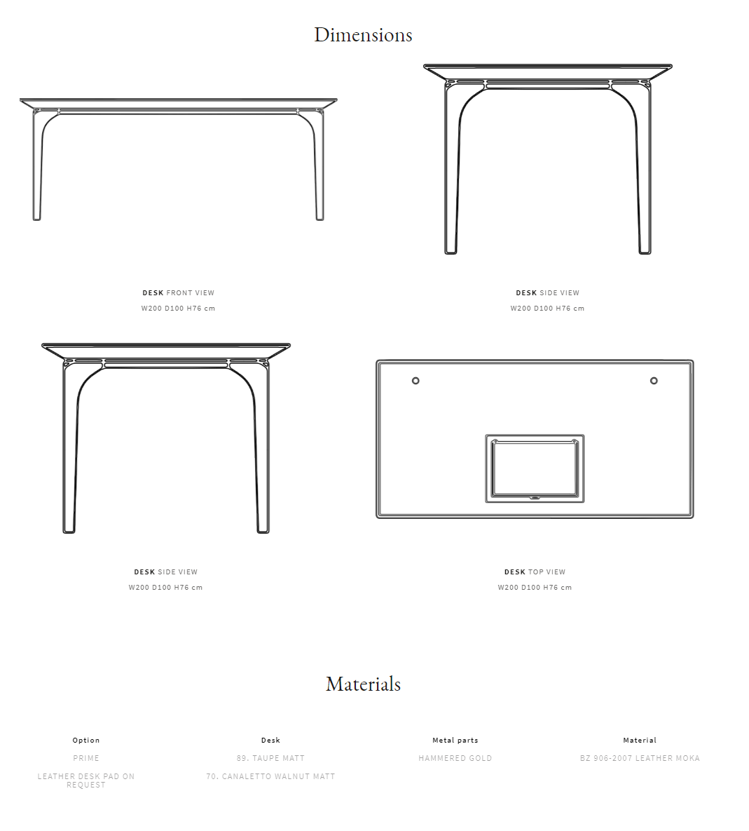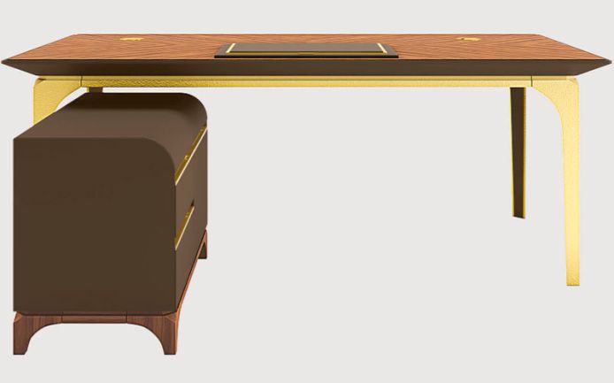 Рама из массива дерева, фанеры и кованого металла. Столешница из шпона ореха каналетто. Доступен с одной или двумя заглушками для кабеля. Кожаная настольная подкладка по запросу.