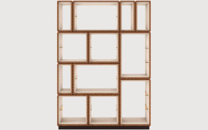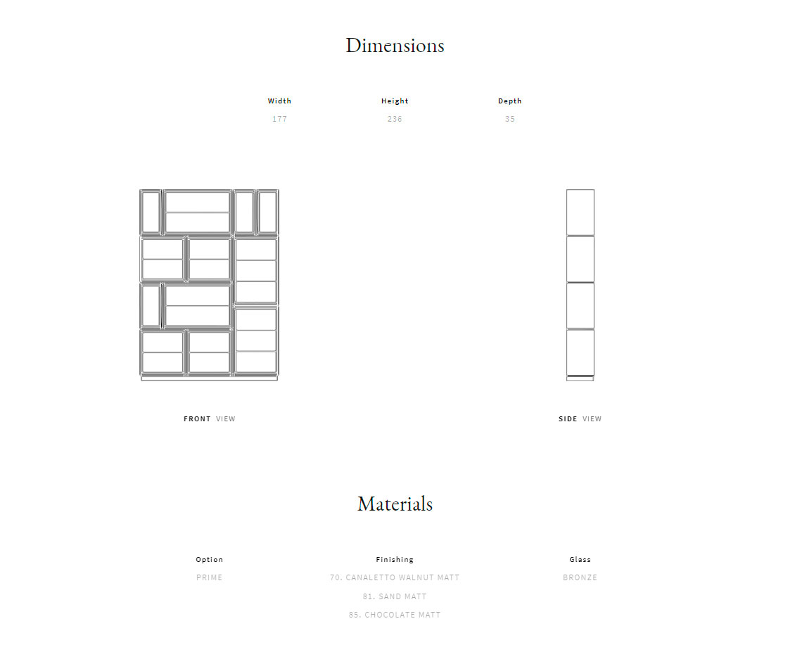 Каркас из массива дерева и фанеры. Доступные материалы внешнего каркаса: лакированная древесина или шпон ореха каналетто. Лакированный внутренний каркас. Xрустальные полки, бронзового цвета.