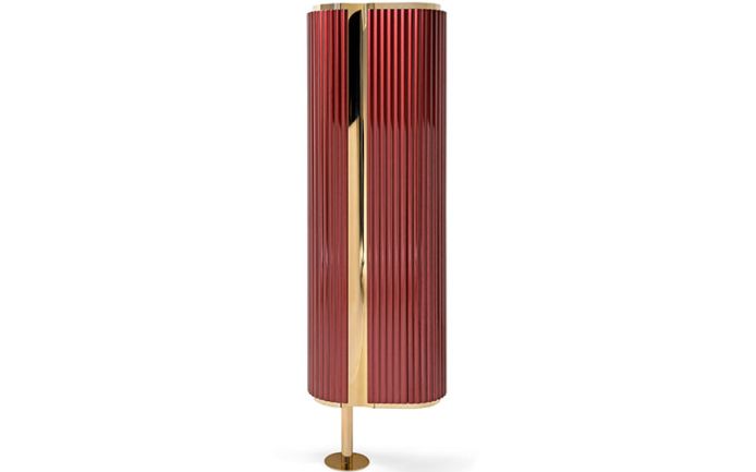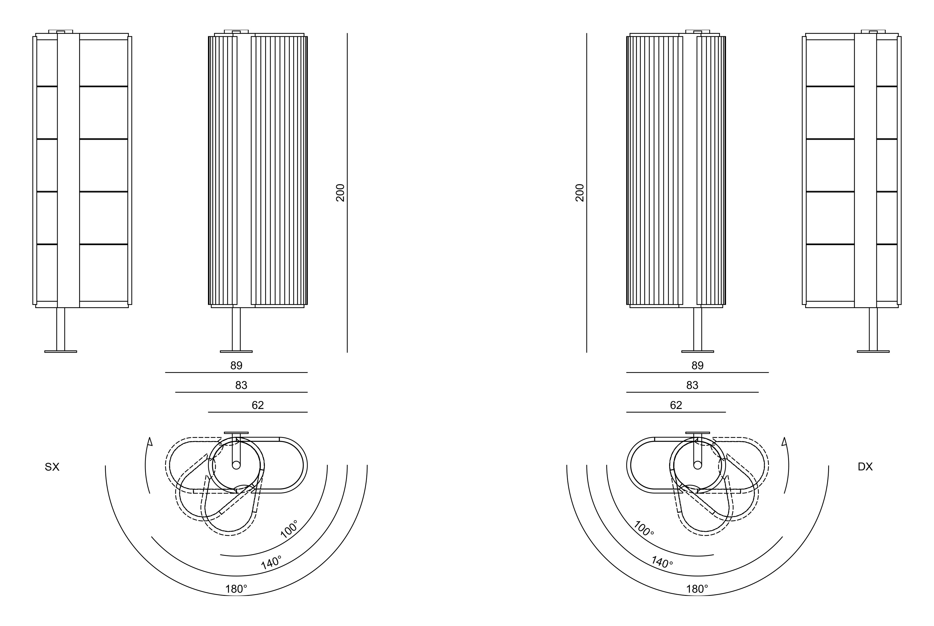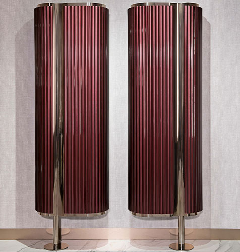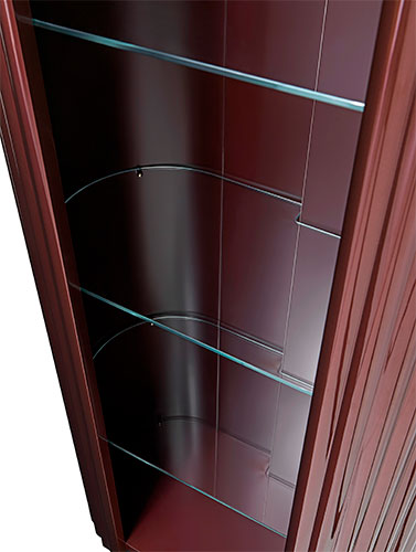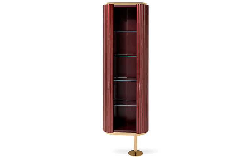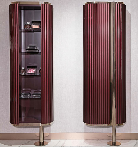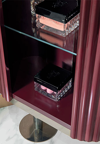 Туалетный шкаф с поворотным механизмом может быть как правосторонней, так и левосторонней. Деревянный корпус с изогнутыми боковинами и барельефной отделкой в рубчик, с глянцевым лакированным покрытием (цвета RAL/NCS) или в отделке металлик в ассортименте.