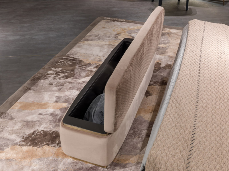 Сундук-банкетка с обивкой из кожи или ткани, с откидным сиденьем из кожи или ткани в плетеной отделке. Внутренний каркас из дерева; основание и профиль сиденья из матовой нержавеющей стали.