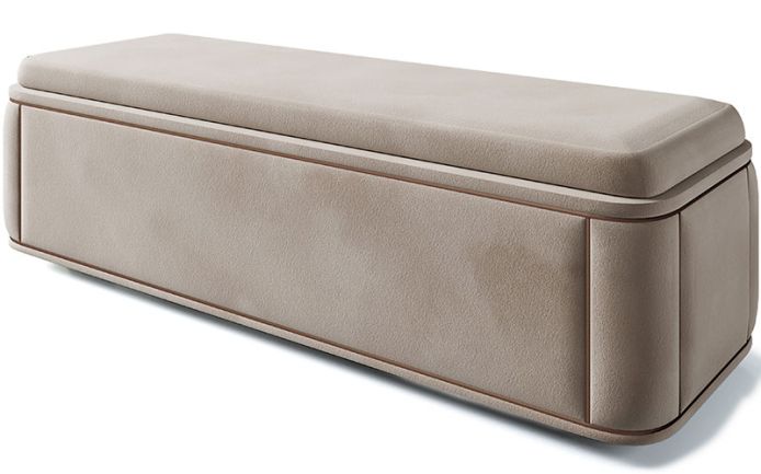 Мягкая скамья с сиденьем из кожи или ткани; деревянный каркас в обтяжке из кожи или ткани с отделкой латунным профилем. Внутренняя конструкция из цельной древесины и многослойной фанеры с обивкой в тон кровати Ripley и внутренним отделением.