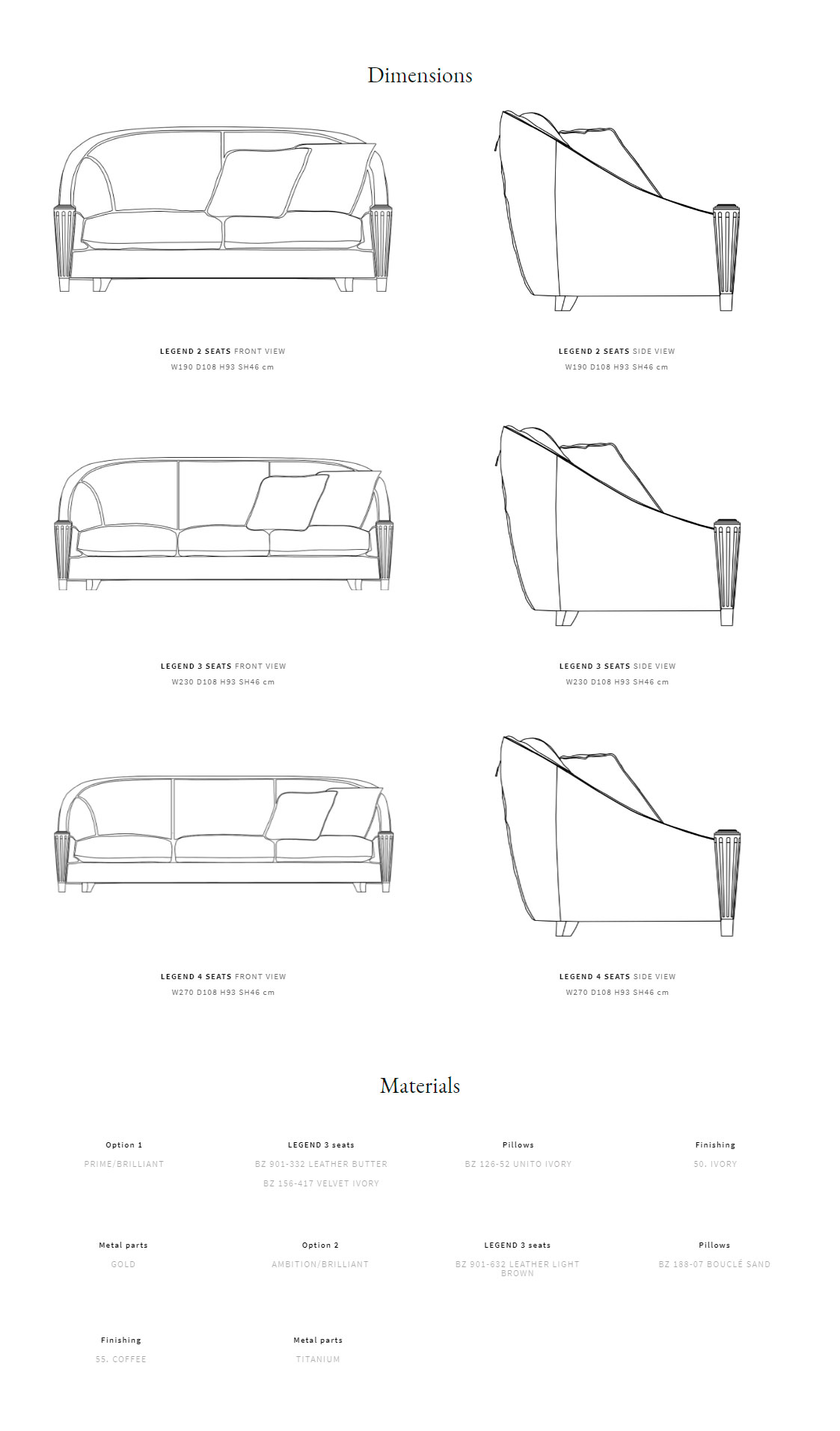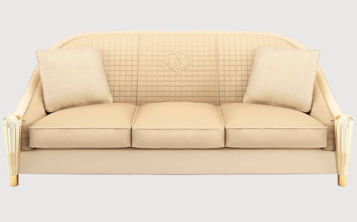 Каркас из массива дерева. Передние ножки из бука украшены элементами из латуни. Стеганая спинка, внешняя часть корпуса с корсетной отделкой. Подушки сиденья наполнены натуральным пером и имеют полиуретановую прокладку. Механизм трансформации отсутствует.