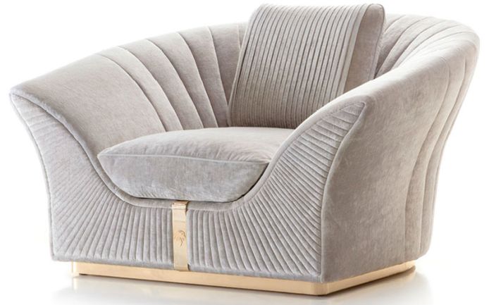 Кресло-софа со стегаными передними частями из кожи первого сорта, нубука, кожи с тиснением под ящерицу, бархата или замши. Сиденье и борта из пенополиуретана, обтянутого пуховым пером. Подушка с кожаной отделкой. 1 большая подушка для спины и основание + передняя вставка из хромированной нержавеющей стали цвета светлого золота с логотипом Giorgio Collection.