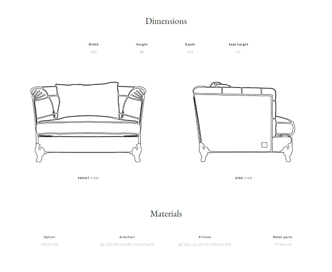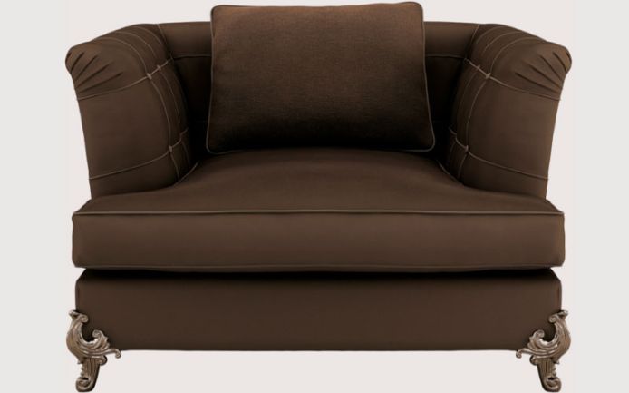 Каркас из массива дерева, ножки из латуни. Стеганая внутренняя часть корпуса с пуговицами. Подушки сиденья наполнены натуральным пером и имеют полиуретановую прокладку.