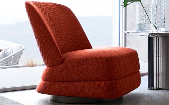 Вращающееся кресло из кожи первого сорта, нубука, кожи с тиснением под ящерицу, бархата или замши. Сиденье и боковины стула с двойной строчкой из пенополиуретана, обернутого пуховым пером. Стеганая спинка с вышитым логотипом Giorgio Collection.