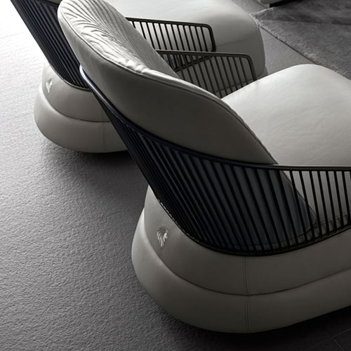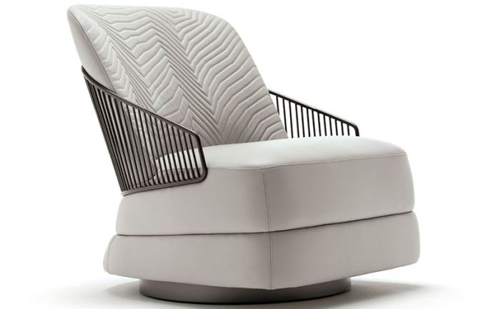 Вращающееся кресло для случайных случаев из кожи первого сорта, нубука, кожи с тиснением под ящерицу, бархата или замши. Сиденье и боковины стула с двойной строчкой из пенополиуретана, обернутого пуховым пером. Стеганая спинка c каркасом из нержавеющей стали с вышитым логотипом Giorgio Collection на основании.