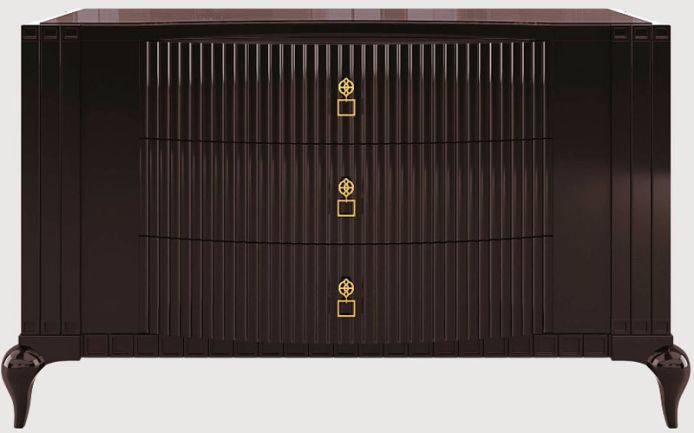 Каркас из массива дерева и фанеры. Деревянные ножки ручной работы. Доступные материалы столешницы: шпон ореха каналетто или макассарского эбена, мрамор. Латунные ручки.