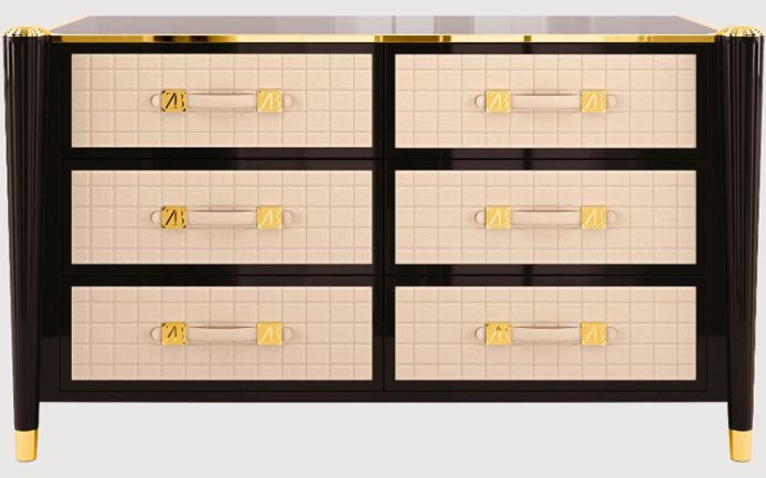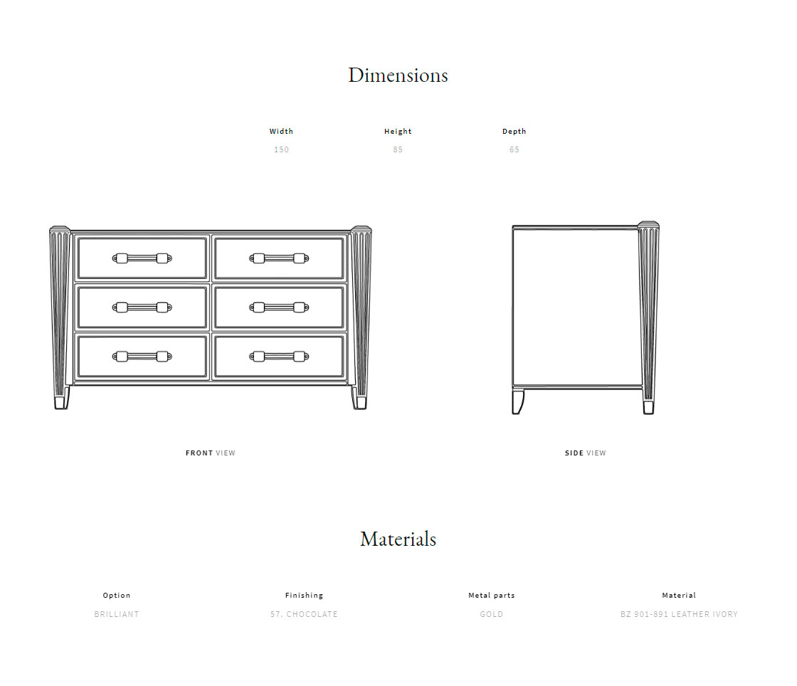 Каркас из массива дерева, фанеры и МДФ. Столешница из лакированной древесины. Боковые части и выдвижные ящики из стеганой кожи. Латунные ручки и детали. Деревянные ножки-колонны с рифлеными украшениями.
