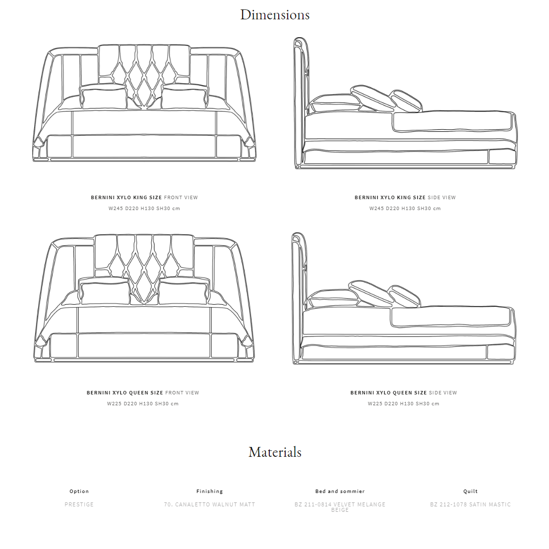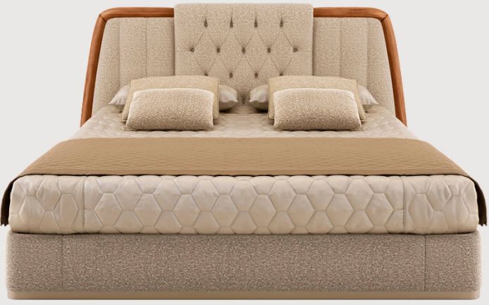 Каркас из массива дерева и фанеры. Изголовье кровати со стеганой отделкой в виде каретной стяжки и вертикальными полосами. Основа и профиль изголовья выполнены из ореха каналетто. Набивка из пенополиуретана разной плотности. С деревянными ламелями. Доступные размеры: Queen size и King size.