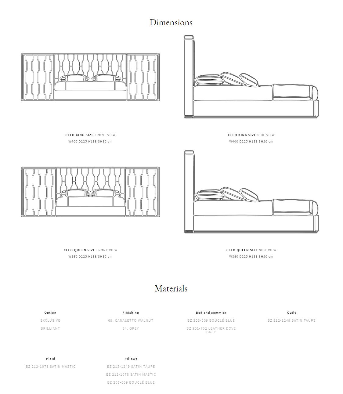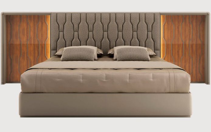 Каркас из массива дерева и фанеры. Боковые углубления из шпона ореха каналетто со светодиодной подсветкой. Набивка центральных панелей из пенополиуретана разной плотности. Каркас кровати и профиль изголовья обтянуты кожей. С деревянными ламелями. Доступные размеры: Queen size и King size.