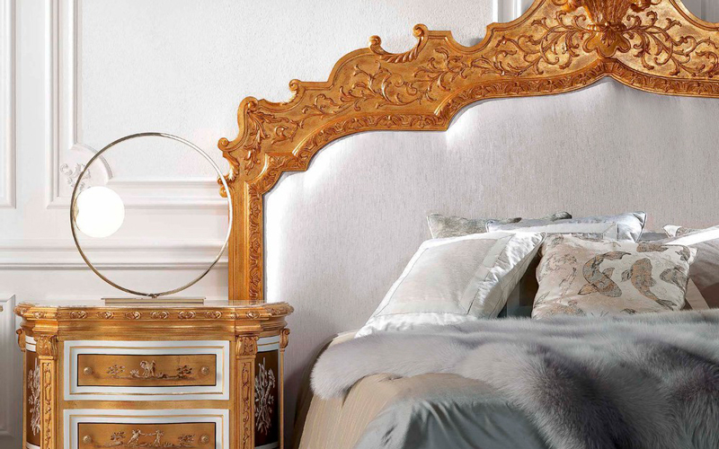 Линия мебели в стиле барокко, идеальное выражение декоративного духа и наследия мастерства Jumbo Collection. Кровать линии Fragonard отличается изголовьем с барельефной резьбой ручной работы, отделанной античным золотом, и дорогой обивкой из тканей коллекции.