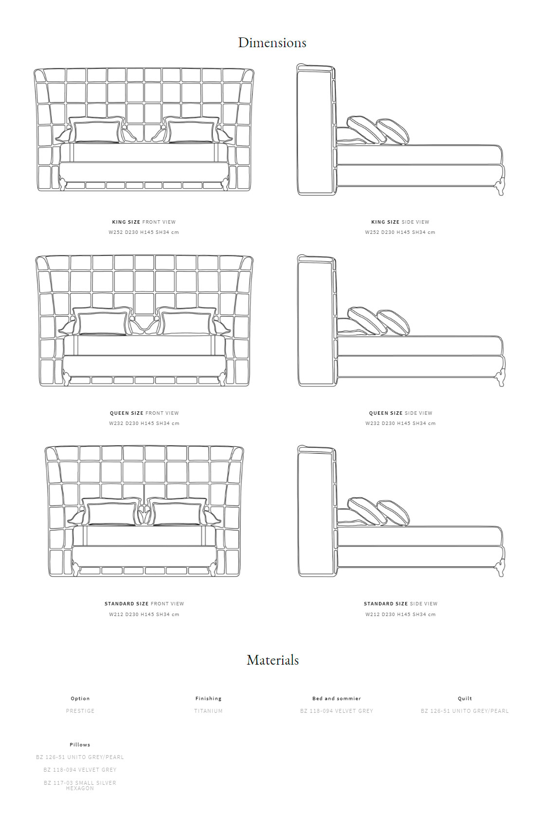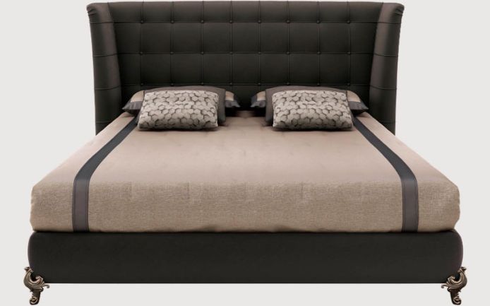 Каркас из массива дерева и фанеры. Стеганое изголовье. Ножки из литейной латуни. Набивка из пенополиуретана разной плотности. С деревянными ламелями. Доступные размеры: стандартный, Queen size и King size. Постельное белье можно приобрести по запросу.