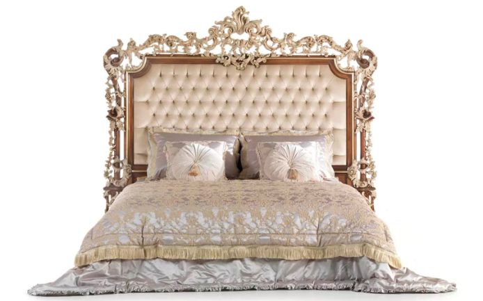 Величественная элегантность стиля рококо в изысканной линейке мебели, которая представляет собой настоящую дань самому аутентичному классическому стилю. Изголовье кровати из коллекции La Grand Dame украшено резьбой ручной работы с отделкой из орехового дерева и патинированной белой и золотой обивкой из драгоценного капитонне.