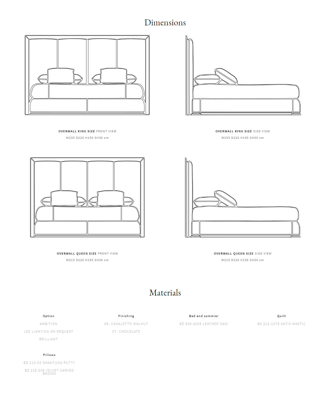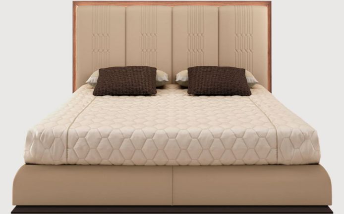 Каркас из массива дерева и фанеры. Рама изголовья кровати из древесины ореха каналетто, со светодиодной подсветкой можно приобрести по запросу. Внутри украшена стеганой кожей. Набивка из пенополиуретана разной плотности. С деревянными ламелями. Доступные размеры: Queen size и King size.