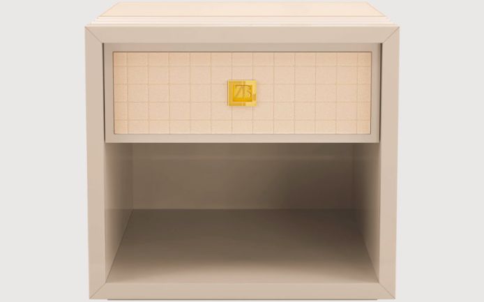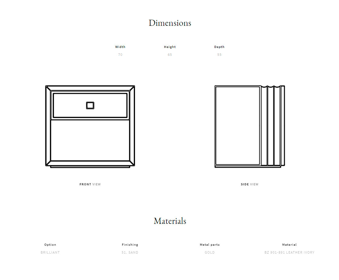 Каркас из массива дерева и фанеры. Кожаная обивка вверху и снаружи. Фасады выдвижных ящиков отделаны стеганой кожей. Латунные ручки.