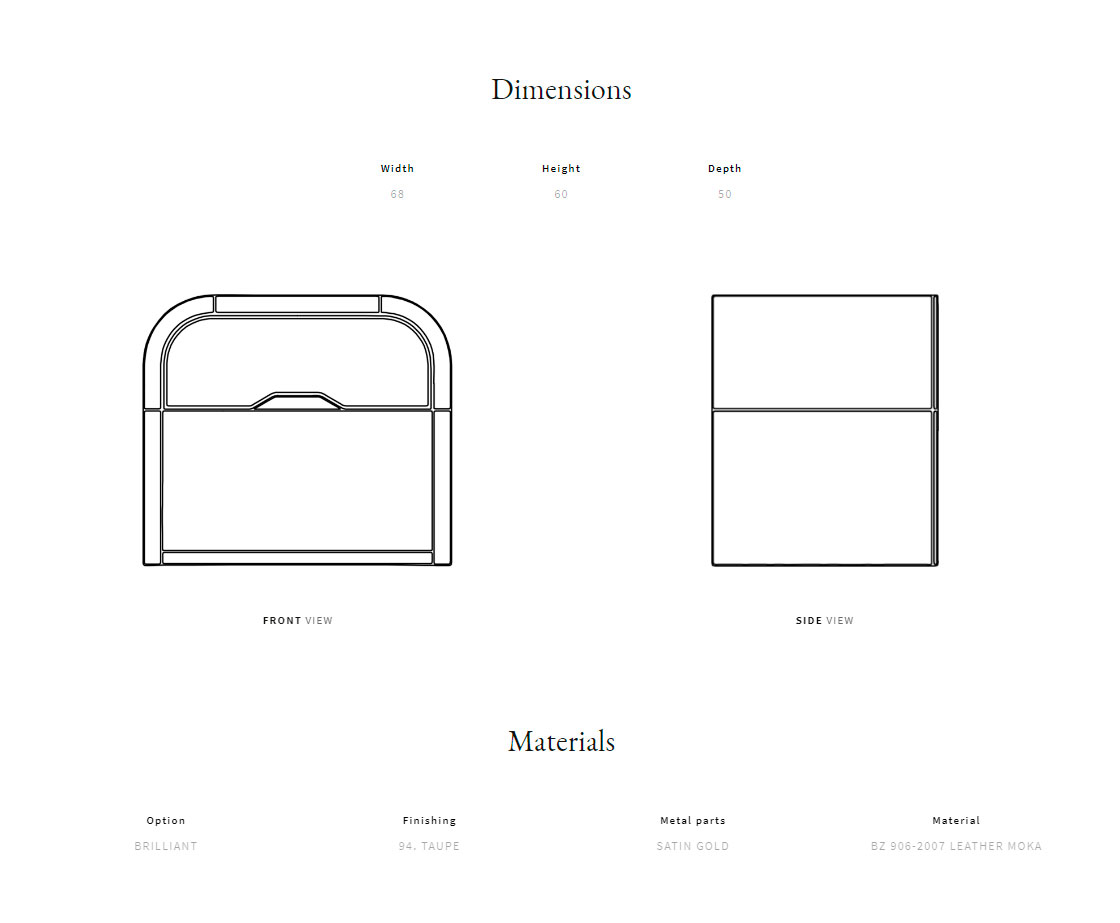 Каркас из сатинированного металла и изогнутой фанеры. Материал: лакированная древесина. Фасад ящика обит стеганой кожей.