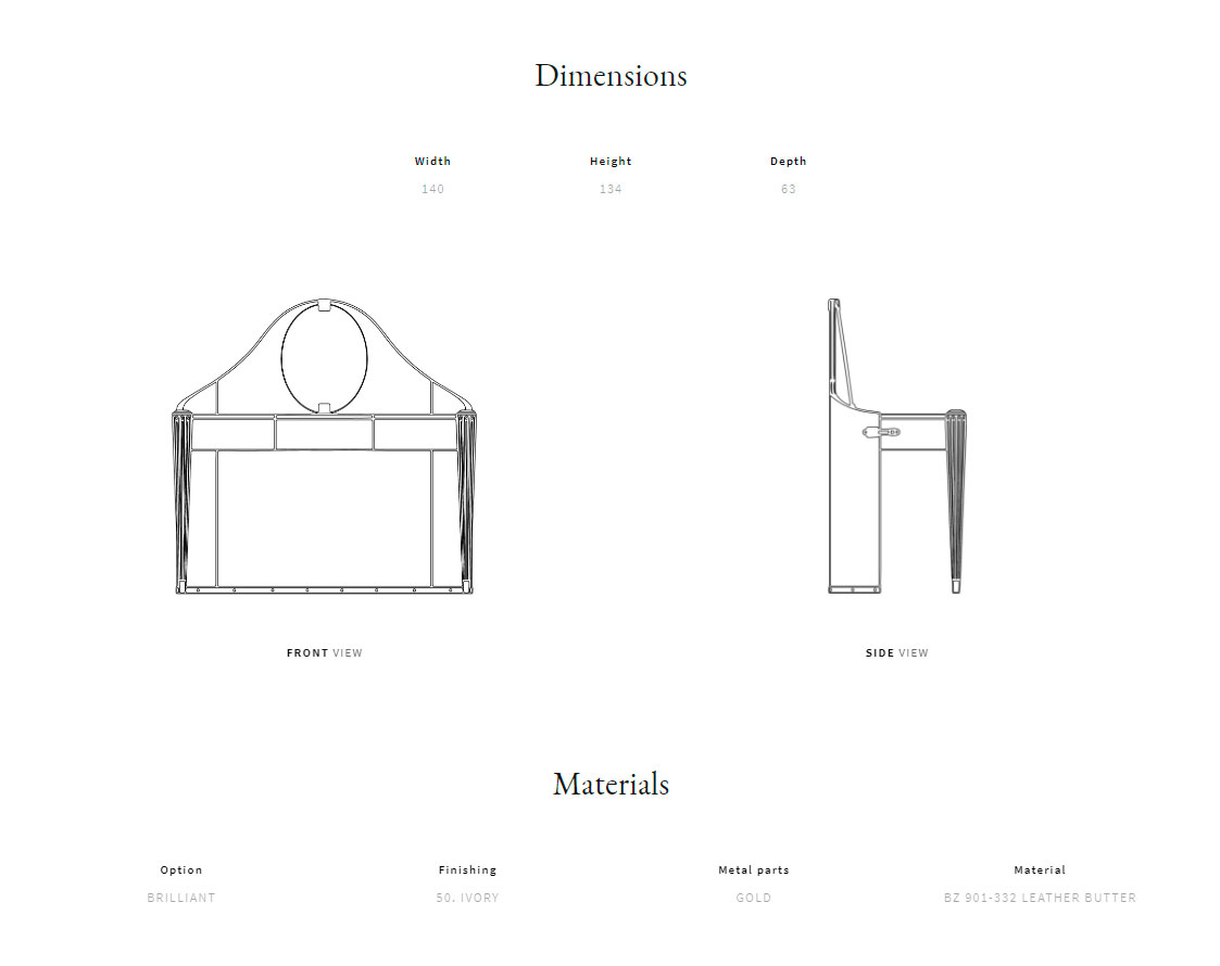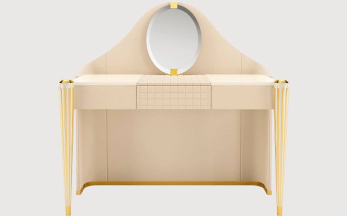 Каркас из изогнутой фанеры, обтянутый кожей. Ножки из древесины бука с металлическими деталями. Выдвижной ящик для украшений со стеганой отделкой. Настольное зеркало.