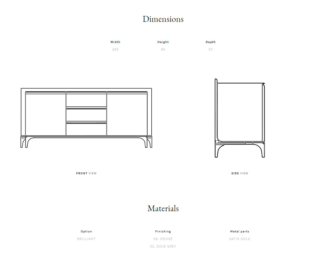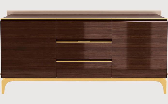 Рама из массива дерева и фанеры. Доступный материал: шпон ореха каналетто. Передние ножки и ручки из сатинированного металла.