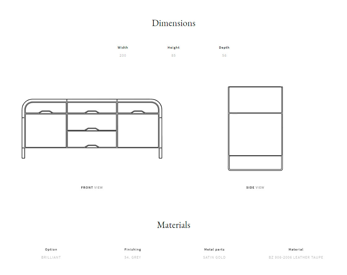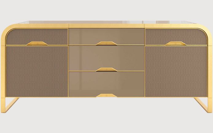 Сатинированный металл и изогнутая фанерная рама. Доступный материал: лакированная древесина. Выдвижные ящики и дверцы, обшитые стеганой кожей.