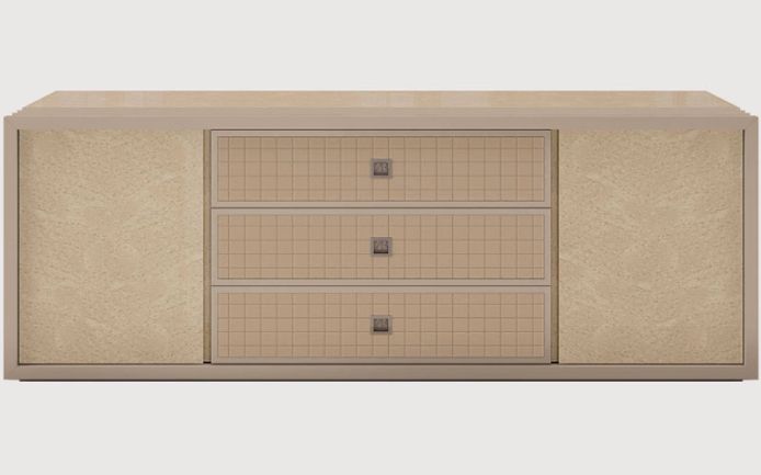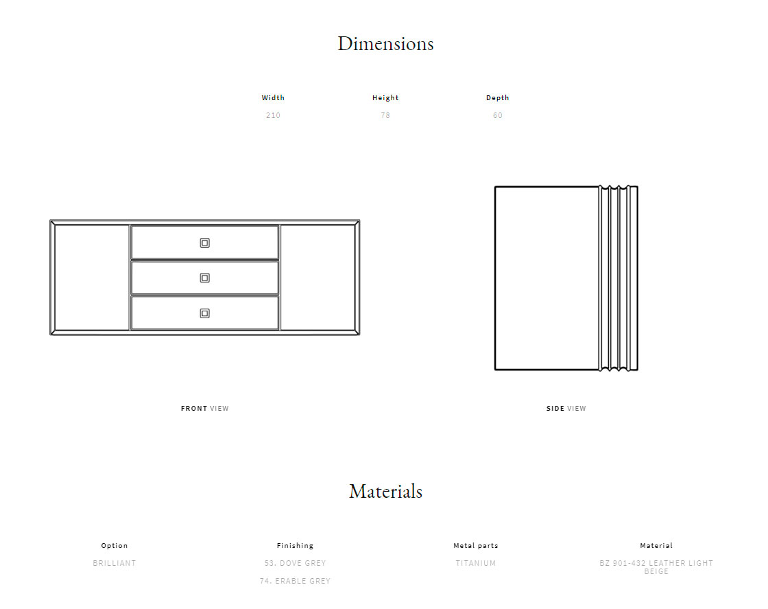 Рама из массива дерева и фанеры. Доступный материал столешницы и дверок: шпон макассарского эбена или шпон серого клена. Выдвижные ящики из стеганой кожи. Латунные ручки.