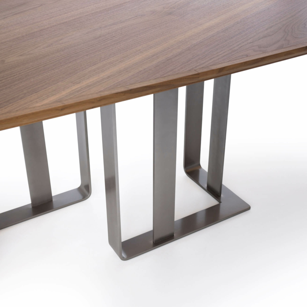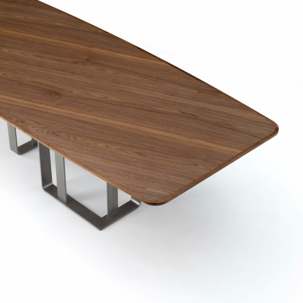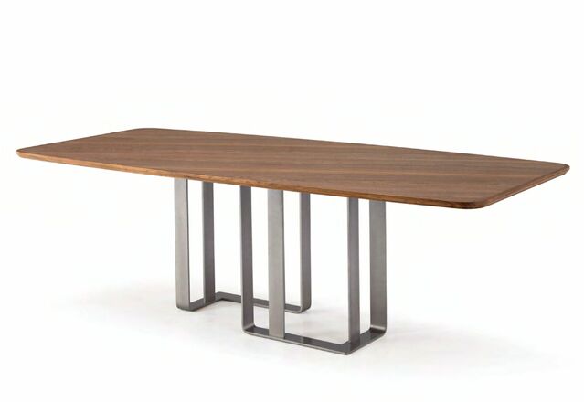 Стол с массивной столешницей из орехового дерева и металлическими ножками отличается современным дизайном, в котором гармонично сочетаются изысканные материалы и динамичные формы. Столешница из дерева доступна в цветах Noce oliato, Ca' Conti, Grey01, Ca' Selva и Colorsense prorgam, а ножки могут быть в цветах Ottone spazzolato, Piombo, Rodio macchiato, Rosé e Terra. Благодаря такому разнообразию вариантов отделки стол идеально подходит для разных стилей интерьера.
